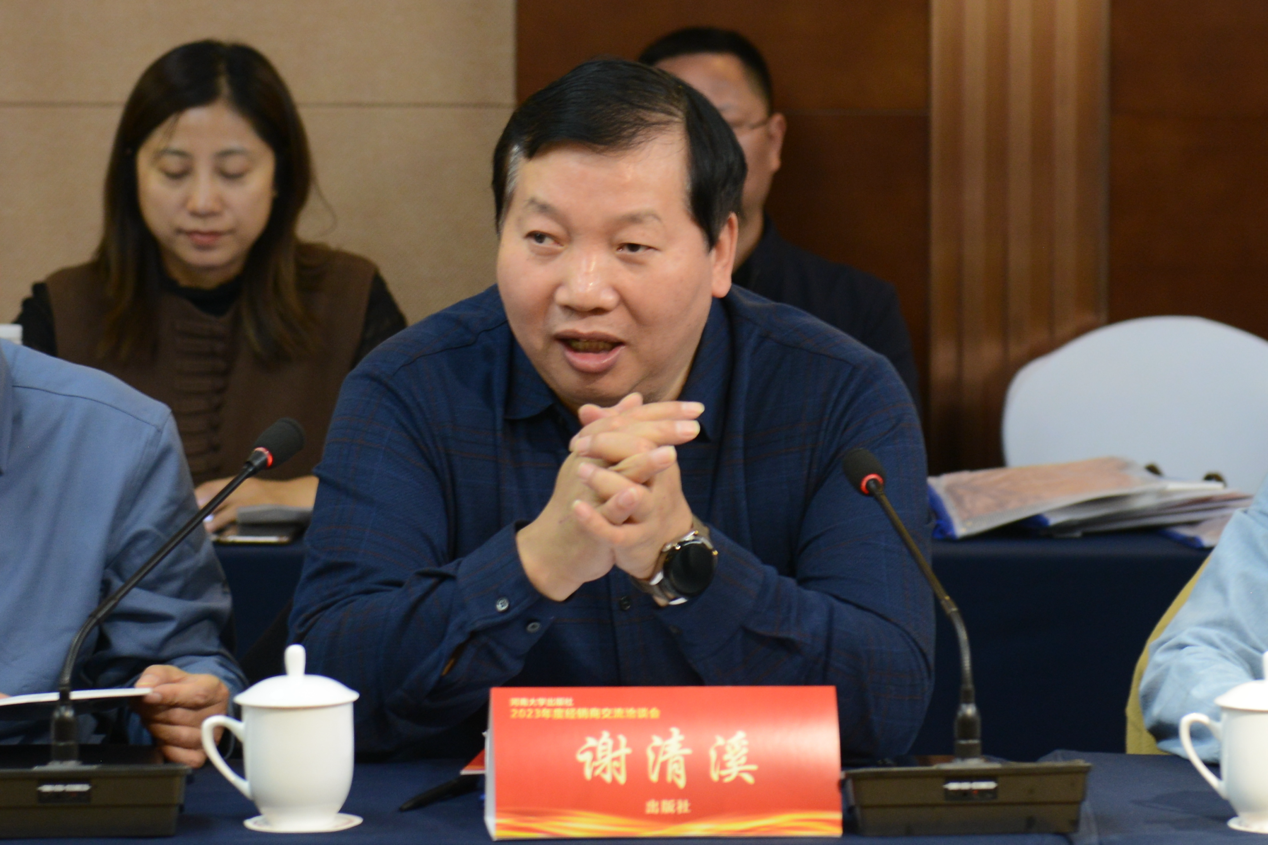随后,谢清溪社长发言。他详细介绍了河南大学出版社的整体情况、出版特色以及未来的发展规划,并结合自身经历畅谈感受,总结和强调了出版社实现高质量发展的具体路径。他表示,在座各位经销商都是河大出版社发展道路上并肩前行的重要战略伙伴,河大出版社图书产品取得的销量和口碑,离不开各经销商长期以来的不懈努力和辛苦付出。感谢大家对河大出版社产品的关注和支持,未来出版社将继续与大家携手共进,加强深度合作、谋求优势互补、深化融合互动、共促转型升级,推动出版社高质量发展。