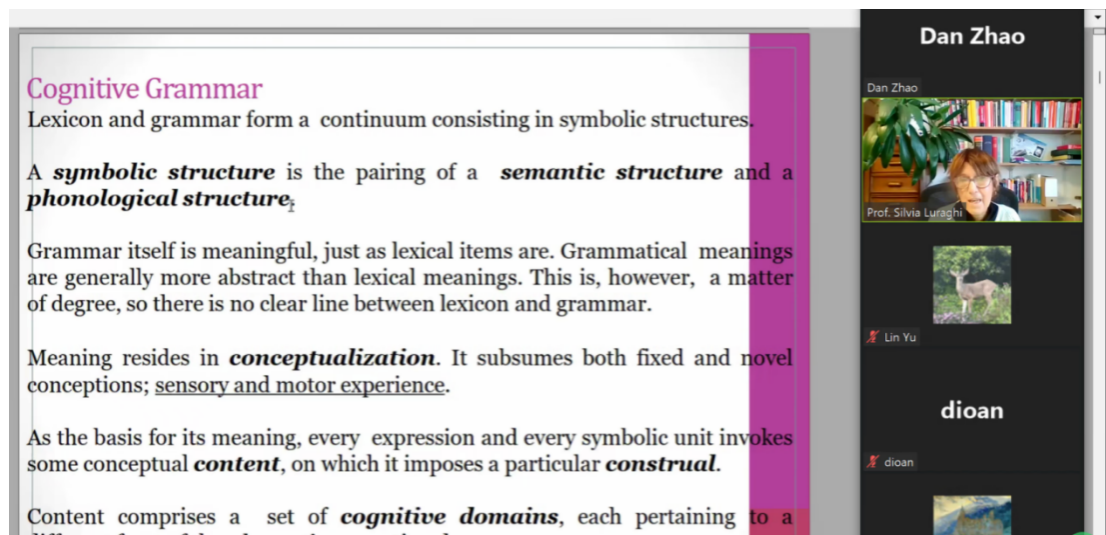 Silvia Luraghi博士的系列讲座主题是“构式语法(Construction Grammar)”。在第一场讲座中,Silvia Luraghi首先介绍了认识语言学的基本观点和相关术语。随后阐述了温度术语的研究价值,并对意大利语和拉丁语中温度术语的不对称性进行了详细论述。