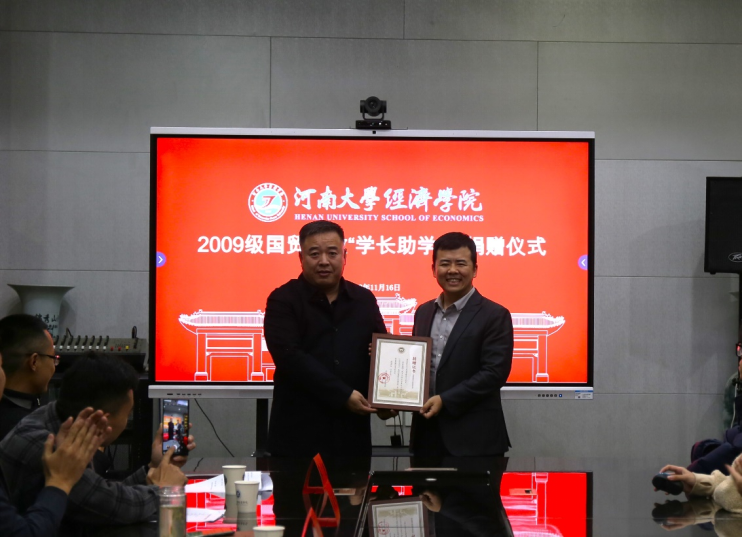 会议伊始,刘会军代表学校进行了致辞。他首先对设立“学长助学金”的2009级国贸财政专业校友表示衷心的感谢,并对获得助学金的同学提出了殷切期望,希望他们脚踏实地、勤勉学习,勤俭节约、自立自强,饮水思源、心怀感恩,谨记学长的关怀和嘱托,积极践行“明德新民,止于至善”的校训精神,努力成为堪当大任的新时代河大青年。随后,刘会军代表学校教育发展基金会向2009级校友代表颁发了捐赠证书。