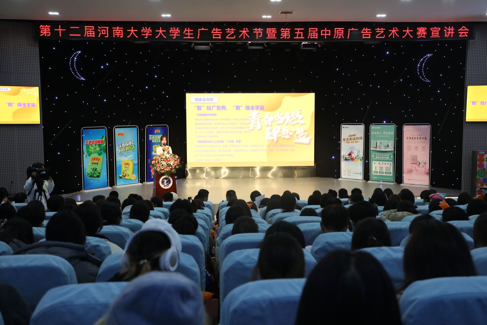 11月23日,第五届中原广告艺术大赛在河南大学明伦校区科技馆二楼报告厅拉开帷幕。本届大赛由河南大学、中原广告艺术大赛组委会主办、河南大学新闻与传播学院、新闻与传播国家级实验教学示范中心(河南大学)承办,王老吉和海尔leader等品牌倾情赞助。广州王老吉药业股份有限公司华中区推广经理王银杰、华中区督查经理于修毅、开封销售经理赵红岩、海尔智家河南分公司营销总监赵瑞韬、leader品牌总监李勃然等企业嘉宾,河南大学党委宣传部、教务处、学生处、校团委、欧亚国际学院、文化旅游学院等职能部门和学院负责人,以及新闻与传播学院师生代表出席开幕式。开幕式由新闻与传播学院副院长高红波主持。