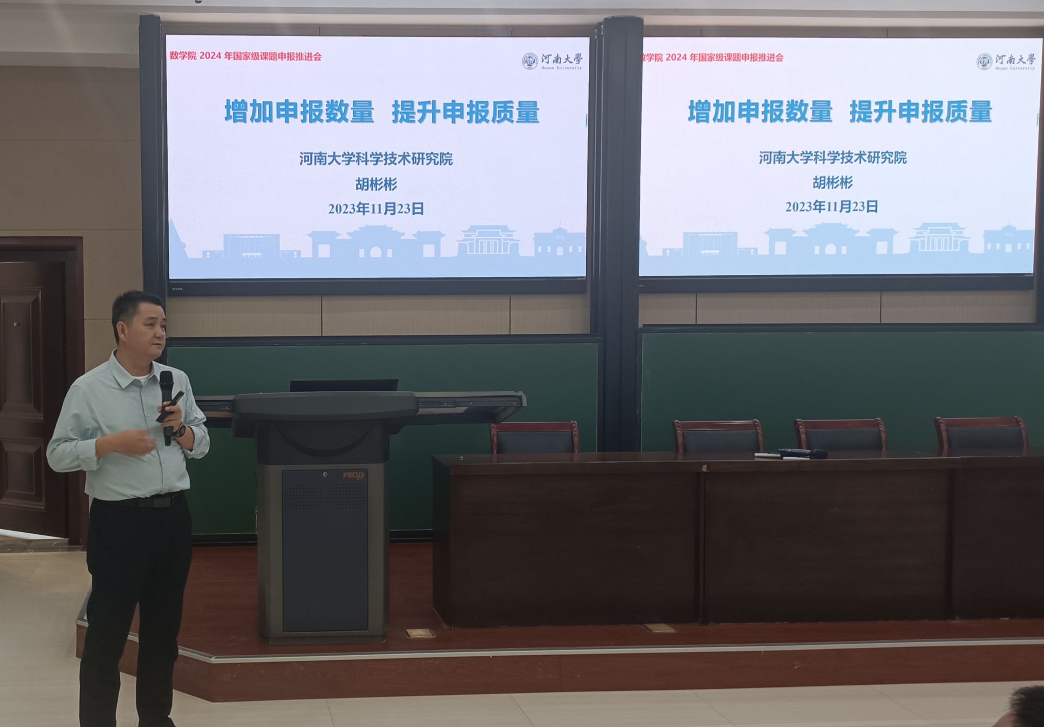 为进一步推进数学与统计学院2024年国家自然科学基金申报工作,11月23日,学院在南阶教室召开2024年度国家自然科学基金申报推进会。校科学技术研究院院长胡彬彬教授出席会议并为学院教师作申报辅导报告。学院领导班子成员,有申报意愿的老师等100余人参加会议,会议由院长韩小森主持。