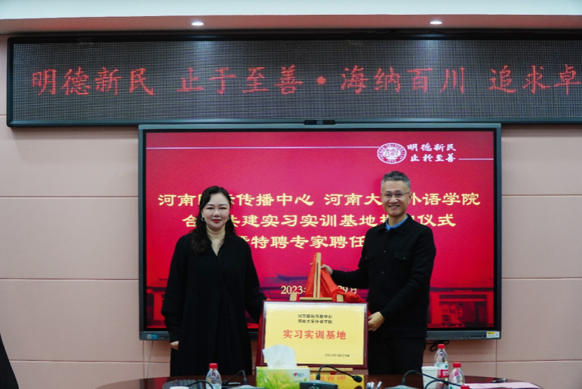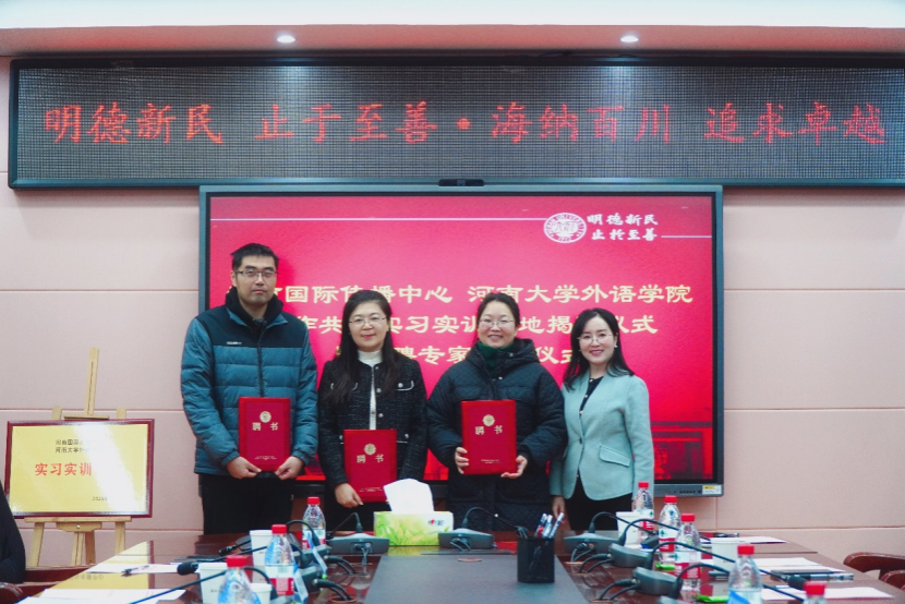 11月29日上午,河南国际传播中心和河南大学外语学院合作共建实习实训基地揭牌仪式暨特聘专家聘任仪式在外语学院北楼二楼多功能报告厅举办。河南国际传播中心主任王曦辉、河南国际传播中心负责人之一兼大河网执行总编辑张培君、外语学院院长张璟慧、副院长赵涛涛及河南国际传播中心特聘专家代表出席了本次仪式,仪式由赵涛涛主持。