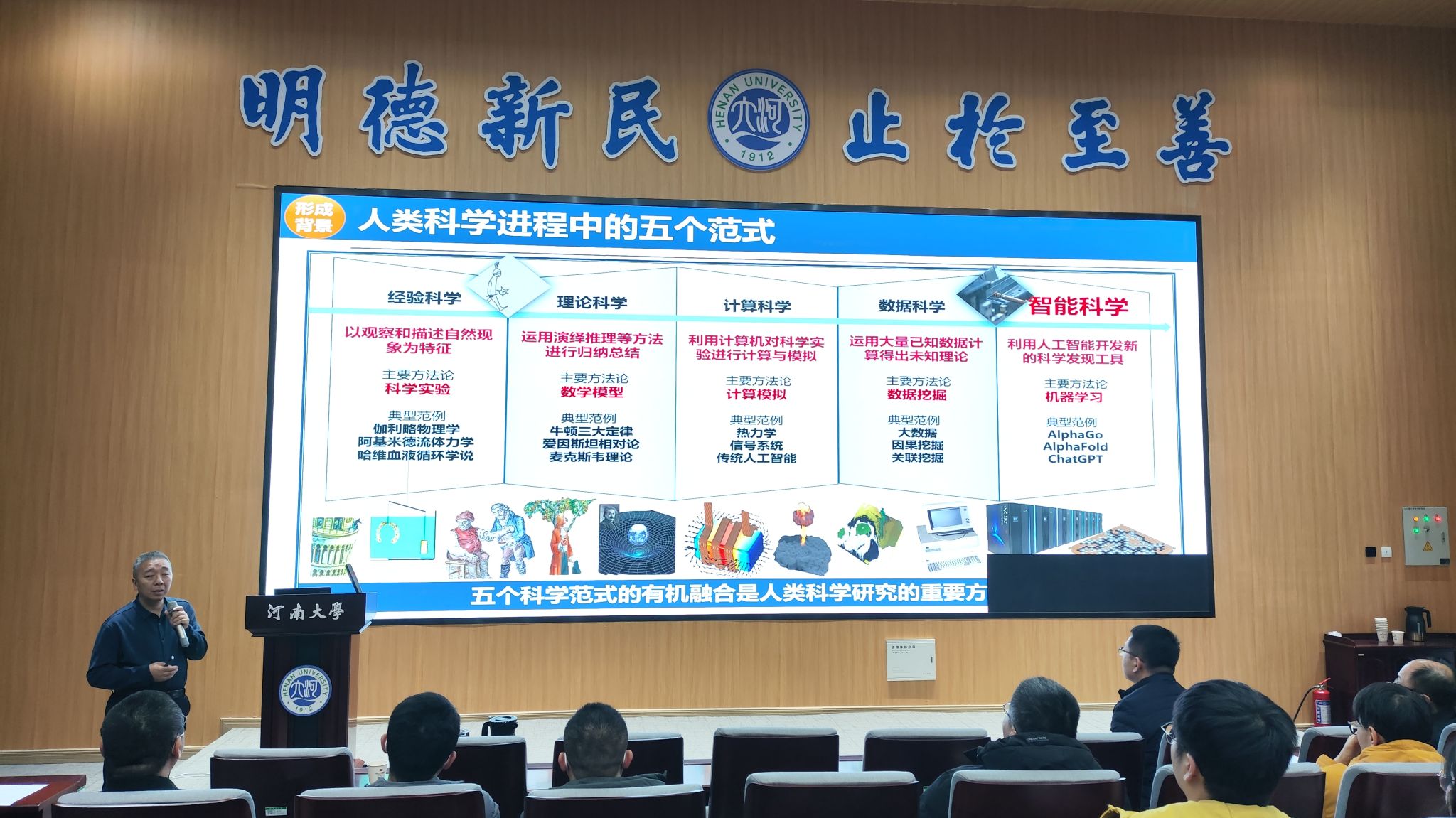 随后,在郑州校区九章学堂南楼B座102报告厅,钱宇华教授为人工智能学院全体教师和研究生作了两场题为《有组织科研探索》和《演化数据智能》的精彩报告,报告由路杨主持。