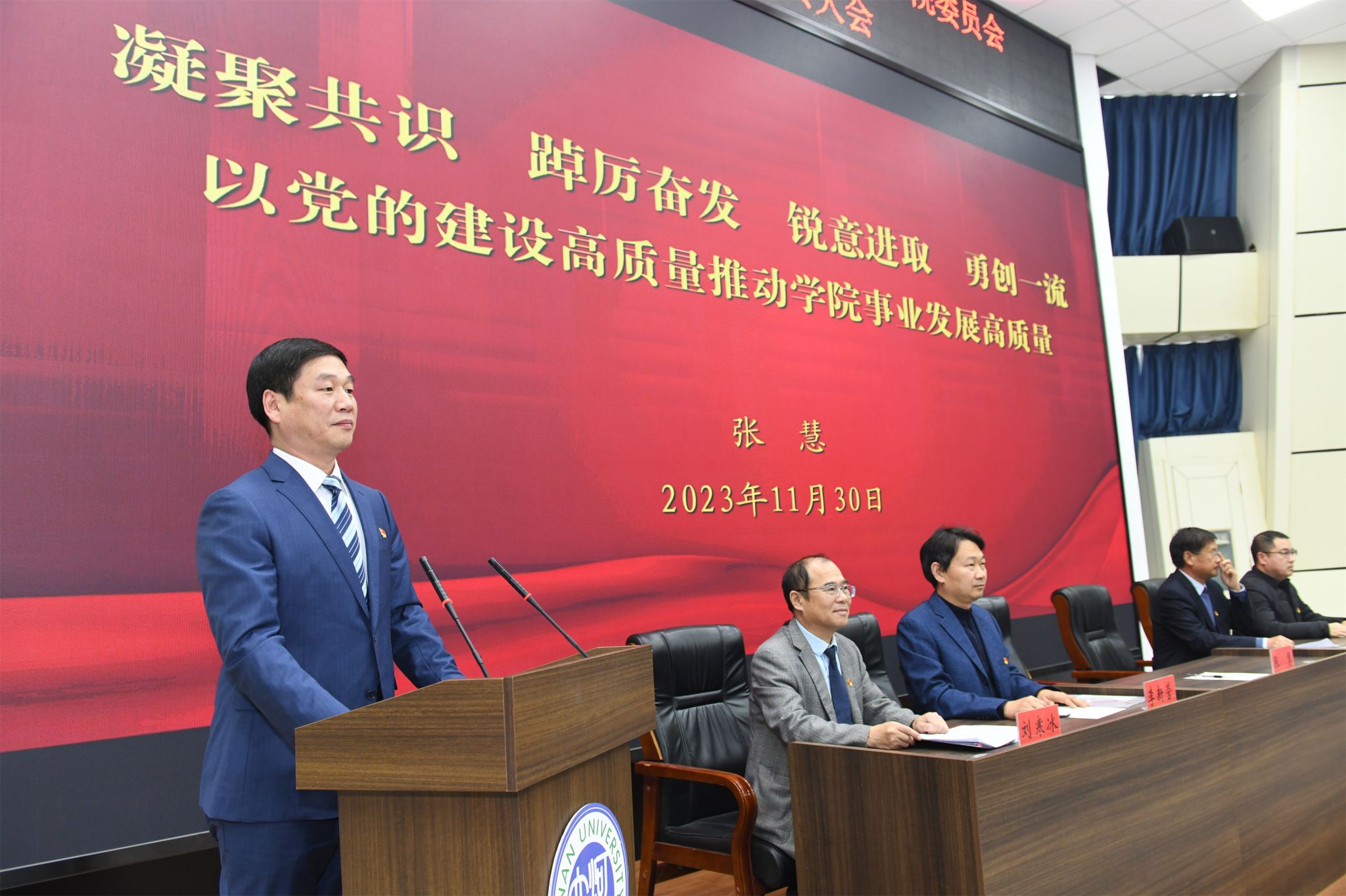 大会在庄严肃穆的国歌声中拉开序幕。学院党委书记张慧代表上一届委员会向大会作《凝聚共识,踔厉奋发,锐意进取,勇创一流,以党的建设高质量推动学院事业发展高质量》的工作报告。报告指出,五年来,学院党委坚持以习近平新时代中国特色社会主义思想为指导,团结带领全院师生员工,认真学习贯彻党的十九大、党的二十大精神,聚焦立德树人根本任务,着力内涵发展,彰显学科特色,在党的建设、人才培养质量、师资队伍、学科与科研、民生及社会服务等方面都取得了可喜成绩和宝贵经验。五年来,学院聚焦立德树人,人才培养质量持续提升;引进培育结合,锻造高水平师资队伍;瞄准科技前沿,科研创新能力显著增强;立足优势特色,学科建设提质增效;强化社会服务,拓宽育人辐射效应;汇聚校友资源,凝心聚力共谋发展;聚焦民生工程,教职工生幸福指数不断提升;办好学科百年庆典,开启学院发展新篇章;坚持党建引领,党的建设全面加强;强化制度建设,基层治理能力明显提升。与此同时,学院发展还存在问题和不足。