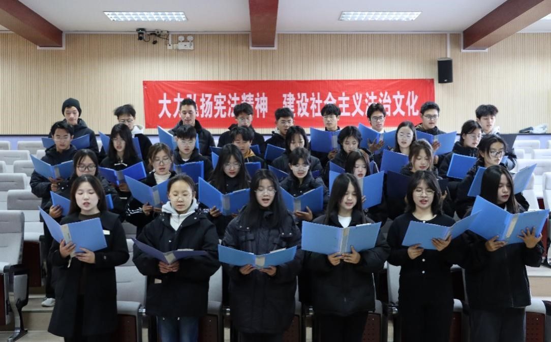 上午九时,宪法晨读活动在院三楼模拟法庭举行,普法志愿者朗读《中华人民共和国宪法》部分条款,铿锵有力的朗读声,不仅向同学们传递着宪法精神的庄严与权威,更让尊崇宪法、遵守宪法、维护宪法之观念根植于心、付之于行。