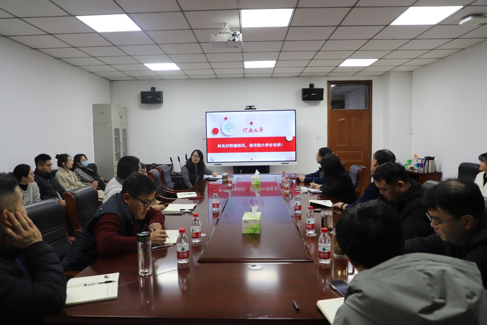 会议第二阶段,学院邀请校党委教师工作部副部长赵炎作题为“树良好师德师风 做河南大学的好老师”的专题讲座。赵炎从解读习近平总书记关于师德师风的重要论述,用精辟的语言,旁征博引、深入浅出地阐述了师德师风建设的重要性和必要性,以及如何加强师德师风建设。她结合近年来教育部公开曝光的高校师德失范典型案例和自身工作经历,对《关于高校教师师德失范行为处理的指导意见》《河南大学教师师德失范行为处理办法》进行了详细介绍,并向老师们阐述了自身对优秀教师的理解和感悟。她提醒老师们要警钟长鸣、严格规范从教行为,将教书育人和自我修养相结合,以德立身、以德立学、以德立教,用良好师德成就个人发展,营造风清气正的教书育人环境。