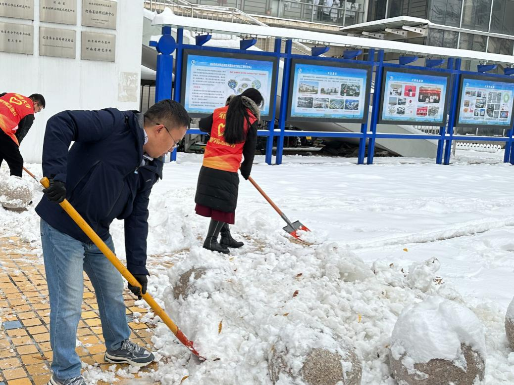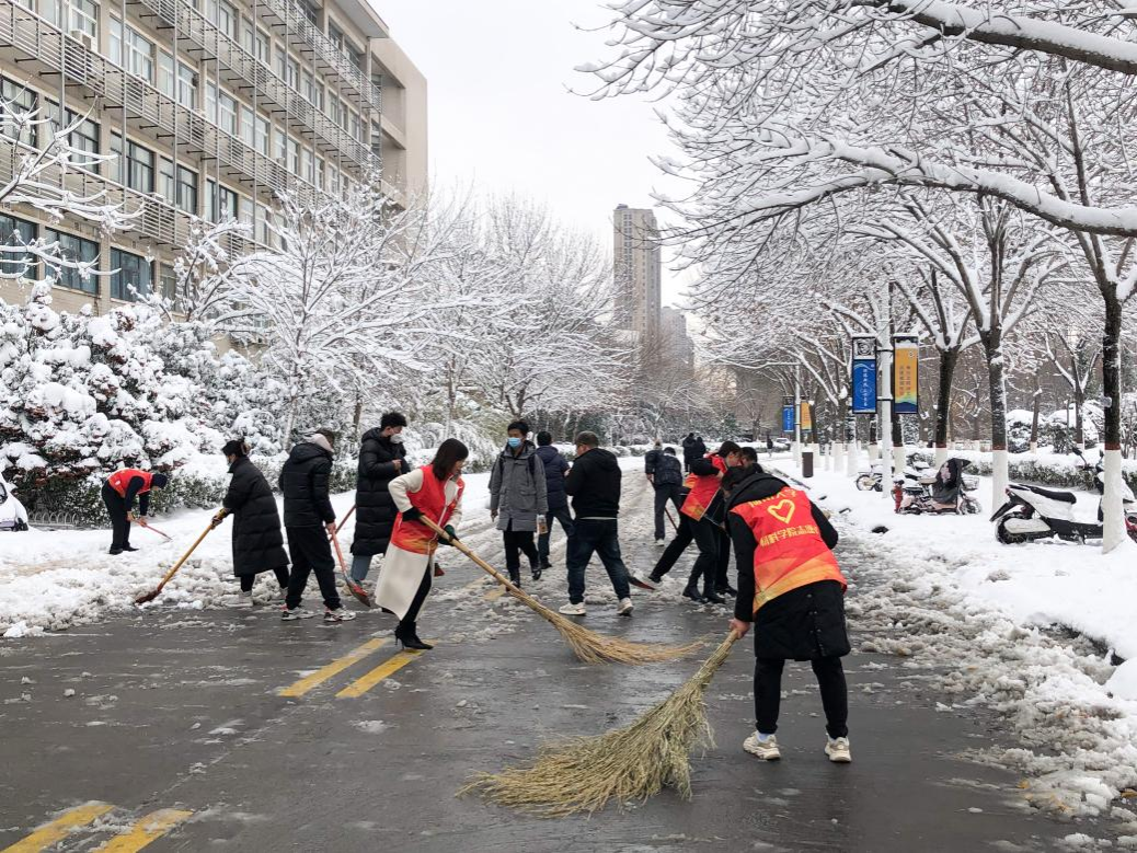 全院教职工纷纷行动、积极参与,穿上红色的志愿者服装,戴上手套,挥舞着扫帚、铁锹等工具,不畏冷风,认真地清扫特功楼前和校园道路上的积雪。虽然天气寒冷,但并没有阻挡住大家的热情,他们有的负责扫雪,有的负责铲雪,大家齐心协力,干得热火朝天。