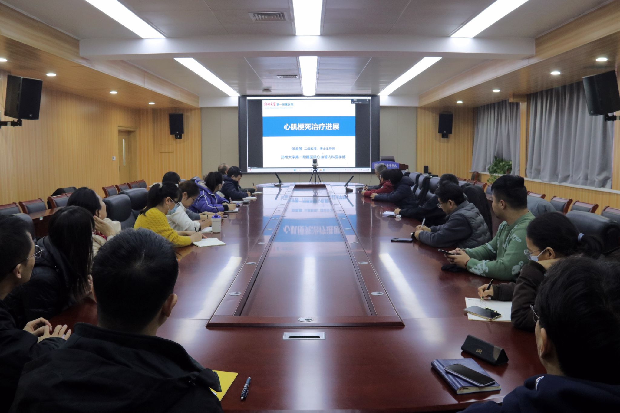 12月14日,总第69期,2023年第15期河南大学“X+医学”学科交叉交流会(X + Medicine Interdisciplinary Biweekly Seminar, “X+MIBS”)在金明校区曾宪梓楼二楼会议室举行。郑州大学第一附属医院心血管内科医学部主任张金盈教授受邀作题为“心肌梗死治疗进展”的报告。抗体药物开封技术国家地方联合工程实验室马远方教授、河南大学第一附属医院副院长郑先杰教授及省特聘教授/河南大学药学院副院长庞晓斌教授作为与谈嘉宾,报告会由河南大学基础医学院副院长柴立辉教授主持。