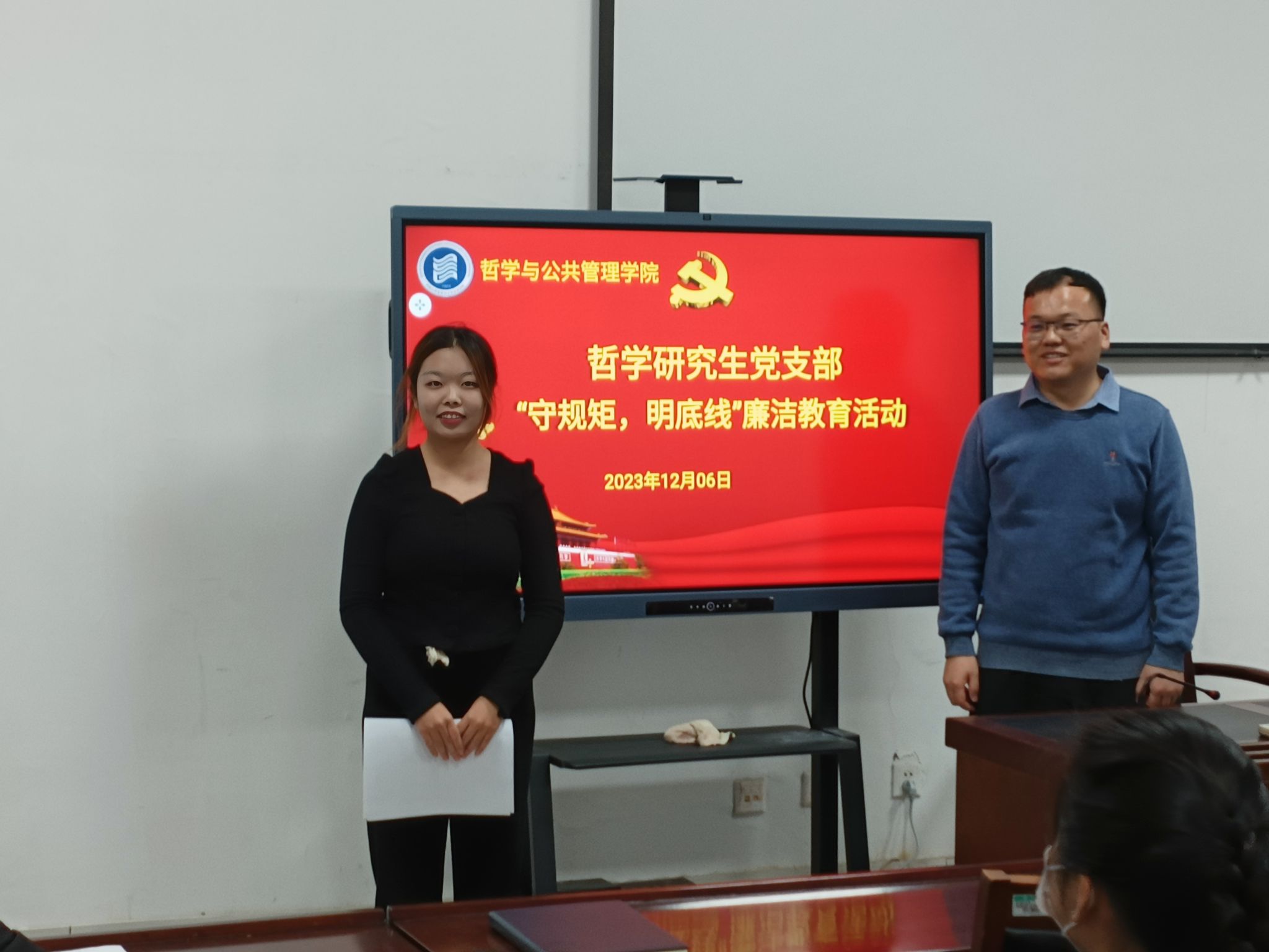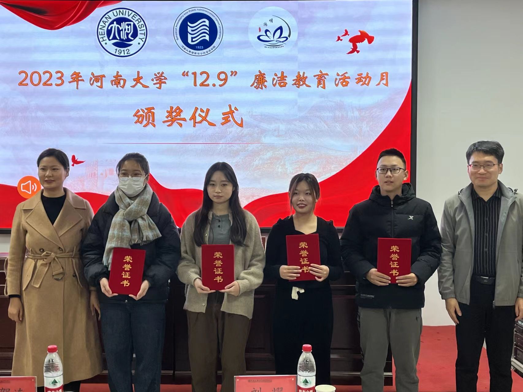 12月9日,廉洁教育月系列活动颁奖典礼在哲学与公共管理学院第四会议室举办。河南大学校纪委刘贺连、哲学与公共管理学院党委副书记何威、团委负责人刘耀出席典礼,并为获奖选手进行颁奖。老师们充分肯定了同学们在比赛中展现出的非凡实力与才华,并鼓励大家再接再厉,书写出更好的作品,弘扬清风正气,构建廉洁校园。