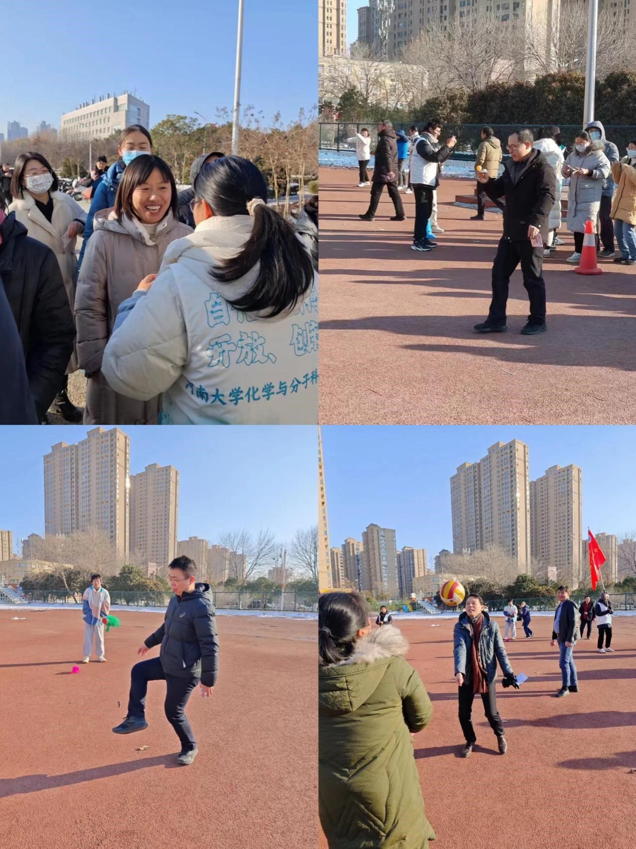 湛蓝的天空下,鲜艳的院旗在队伍前列迎风飘扬。在欢声笑语中,老师们迈开矫健的步伐,快乐前行。大家一路看着校园的冬日美景,呼吸着雪后的清新空气。在打卡环节,老师们猜字谜、唱歌曲、踢毽子、打排球、运乒乓,玩得不亦乐乎,笑颜在冬日暖阳下灿烂绽放。活动结束后,老师们还在意犹未尽地聊着生活、工作和对未来的向往,用健康的身心和饱满的姿态投入到学校 “双一流”建设新征程!
