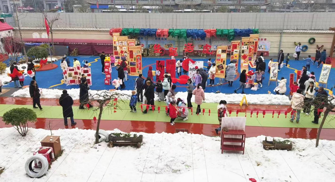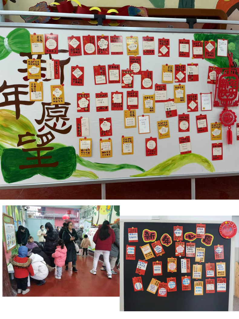 早晨,家长和小朋友们怀着期待的心情,喜笑颜开地来到幼儿园,在老师们的热情接待下,家长们有序入园然后在祝福墙上为小朋友写下行年的祝福。校园里,老师们和孩子们一起制作了新年展板,喜庆的灯笼高高挂起,一件件精致又充满氛围感的饰品,让孩子提前感受到新年浓浓的气氛,整个幼儿园都洋溢着浓浓的年味!
