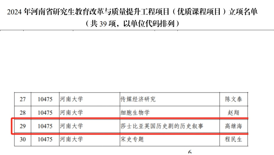 近日,经个人申请、学校推荐、专家评审,2024年河南省研究生教育改革与质量提升工程项目予以公示,外语学院获批项目2项。其中,高继海教授主持申报的《莎士比亚英国历史剧的历史叙事》获得优质课程项目立项,屈璟峰博士主持申报的《课程与教学论》获得精品教学案例项目立项。