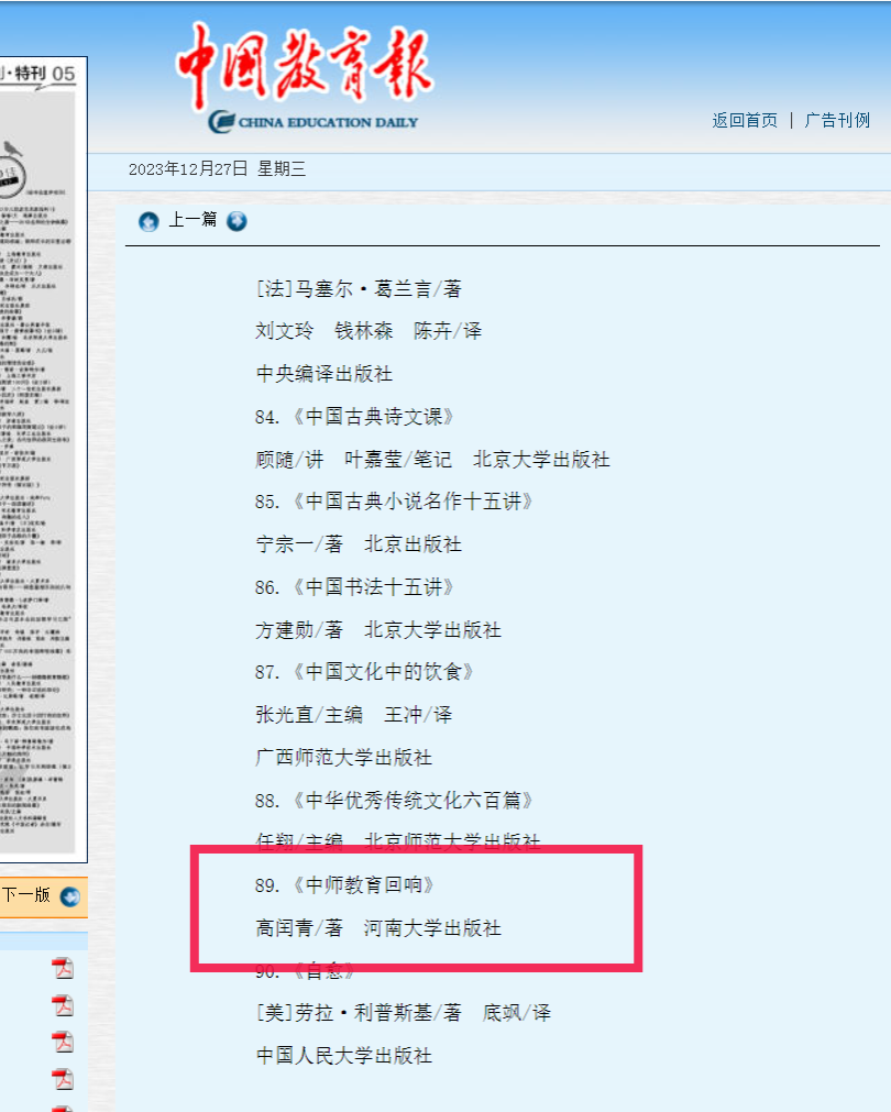 12月27日,“《中国教育报》2023年度教师喜爱的100本书”评选结果正式发布,河南大学出版社《中师教育回响》入选。该书也是河南省出版机构唯一入选的图书。