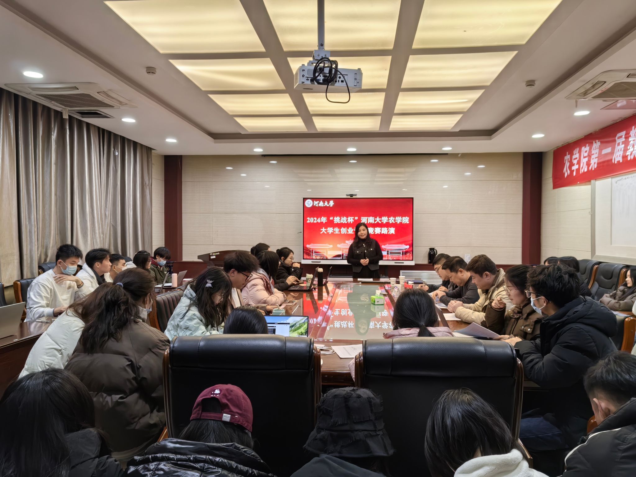 挑战点燃梦想,创新铸就辉煌。为提高大学生的创新精神和实践能力,1月2日晚,农学院举行2024年“挑战杯”大学生创业计划竞赛路演。校团委副书记董文、经济学院管利老师、校团委社会实践与科技创新部部长丁宇航应邀作为此次路演评委。2023级全体研究生及本科生参加。路演由学院党委副书记曹玉辉主持。