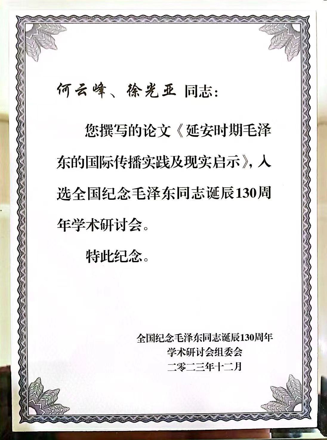 何云峰教授长期致力于毛泽东思想和生平研究,在该领域发表了数十篇高质量的研究论文,多篇被人大复印资料全文转载。为了参加这次学术研讨会,他精心构思选题,广泛收集资料,反复推敲写作框架,和他指导的研究生徐光亚共同完成了《延安时期毛泽东的国际传播实践及现实启示》这篇论文。功夫不负有心人,论文最终入选,这也是河南省唯一的一篇入选论文。