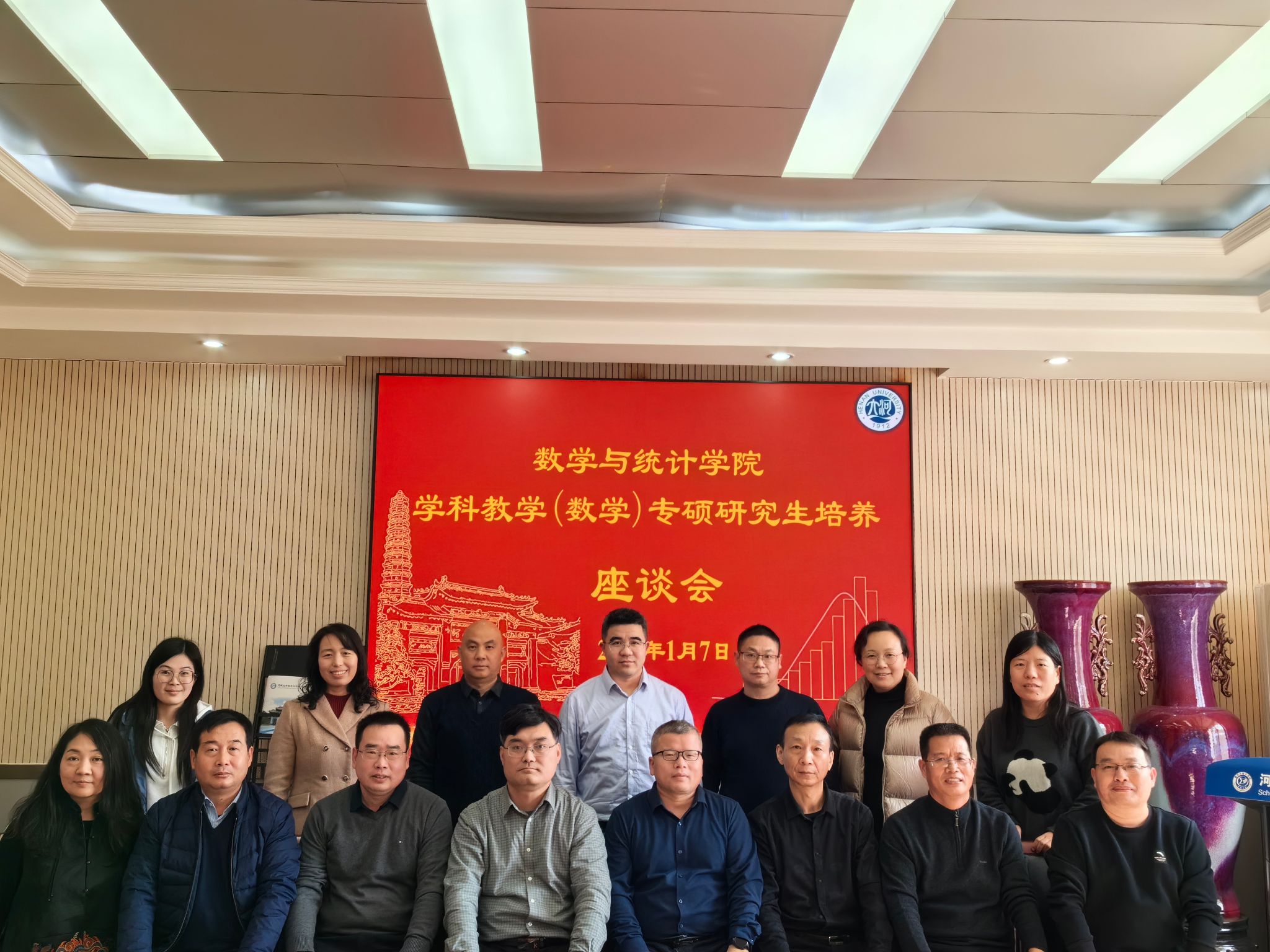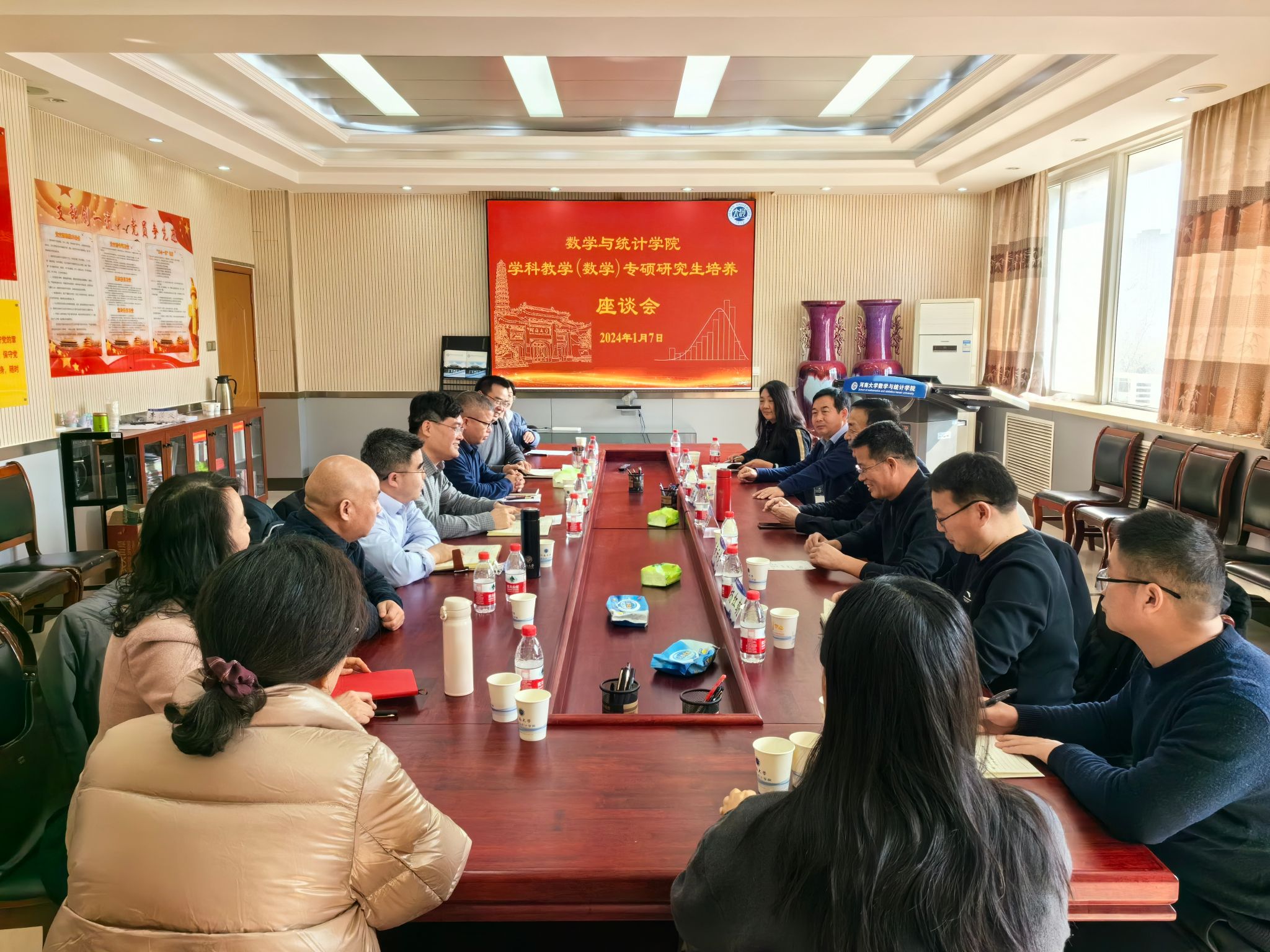 为进一步夯实“双导师制”培养机制,提升专业学位研究生培养质量,1月7日,数学与统计学院在学院二楼会议室举行了学科教学(数学)专业学位研究生培养工作座谈会。会议邀请了研究生职业导师代表,河南大学附中丁仲荐、黄云龙、杨红朝,商丘一高张志华和开封第十四中学秦俊兰等老师参会,学院党委书记曹志伟、院长韩小森、副院长解俊山和学业导师代表参加了座谈会,会议由解俊山主持。