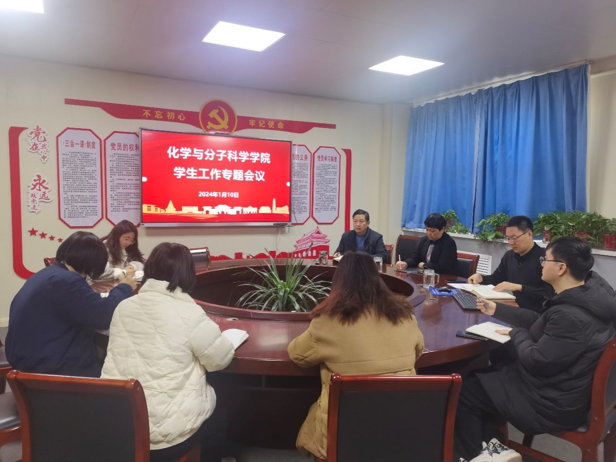 为进一步做好学生工作,提高思想政治工作的质量,为一流学科建设提供重要支撑,1月10上午,化学与分子科学学院在党员活动室召开2024学生工作会议,对学院2023年工作进行了全面总结,并对2024年学生工作进行了规划。学院党委书记常凤香、教学副院长张磊、党办主任、团委书记和全体辅导员参加会议,会议由院党委副书记马文海主持。