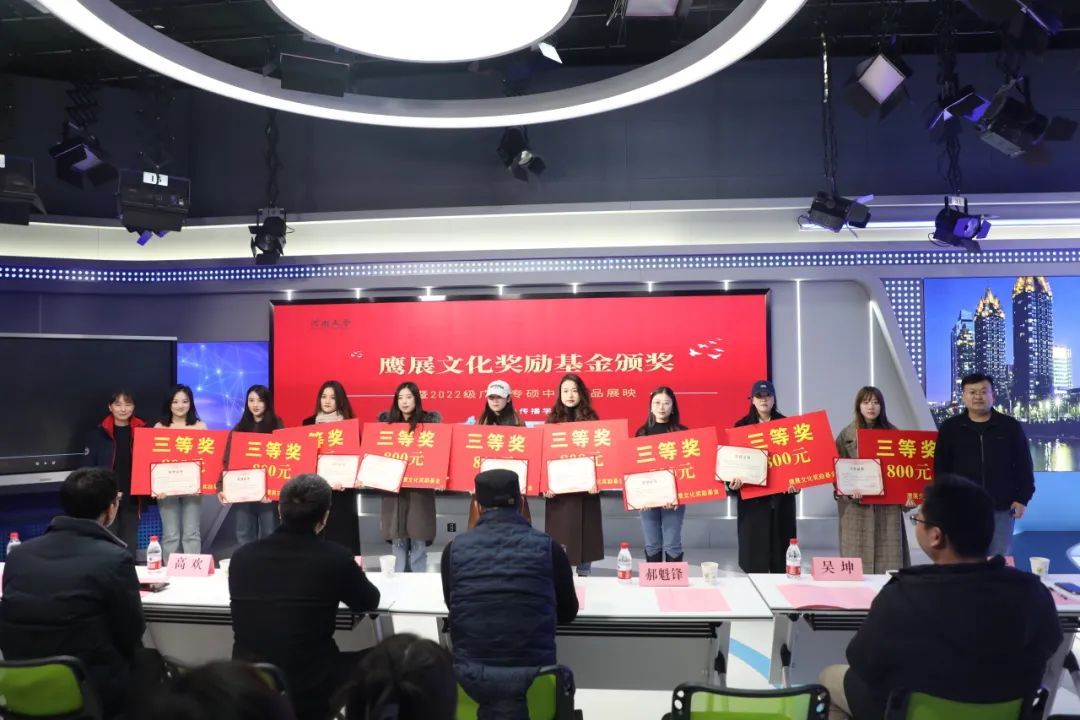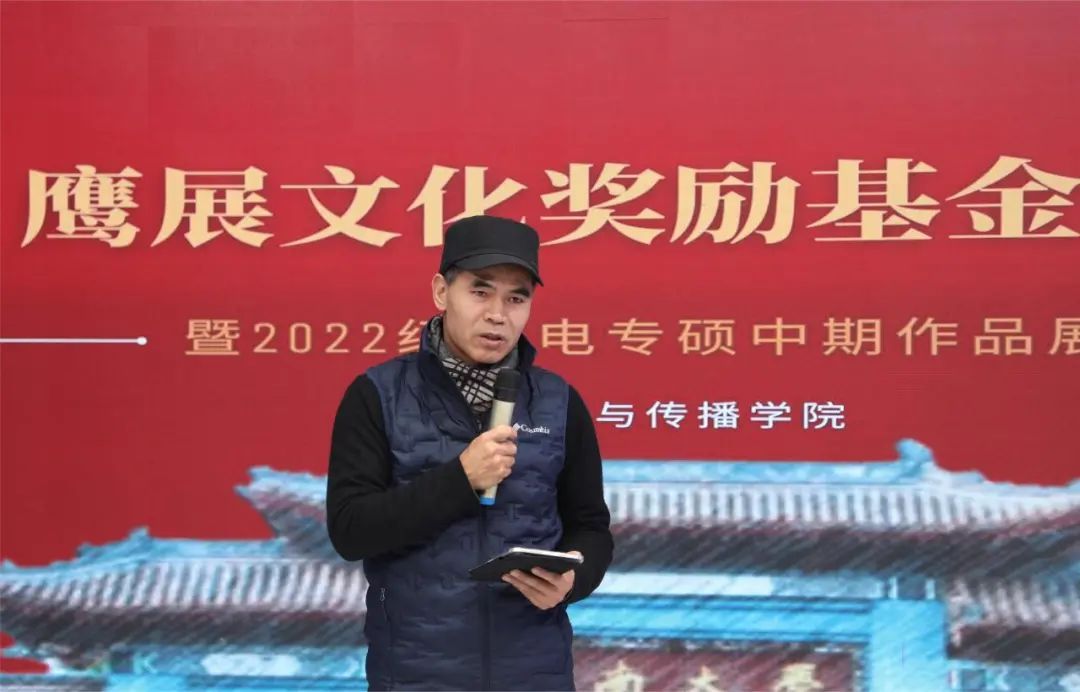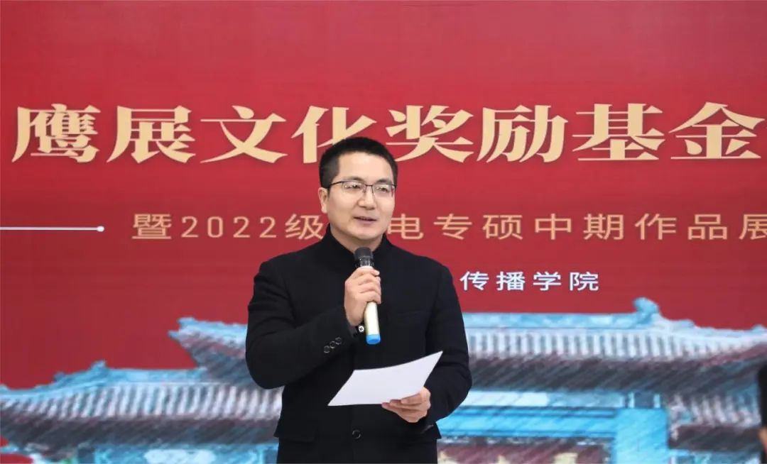 1月12日上午,河南大学新闻与传播学院鹰展文化奖励基金颁奖典礼暨2022级广电专硕中期作品展映活动在明伦校区科技馆504演播厅举行。河南鹰展创始合伙人、1990级校友陈举,河南大学教育发展基金会副秘书长高欢,党委研究生工作部副部长、教育管理办公室主任吴坤出席典礼。新闻与传播学院党委书记乔石豪,党委副书记郝魁锋,新闻系主任赵红勋,广播电视专硕学科带头人曹毅梅及2022级广播电视专硕研究生参加典礼。