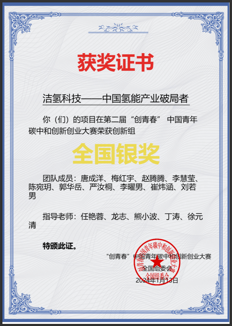1月13日,第二“创青春”中国青年碳中和创新创业大赛全国总决赛在北京落幕,经过激烈的角逐,我校化学与分子科学学院代表队以《洁氢科技——中国氢能产业破局者》作为参赛项目荣获全国银奖。