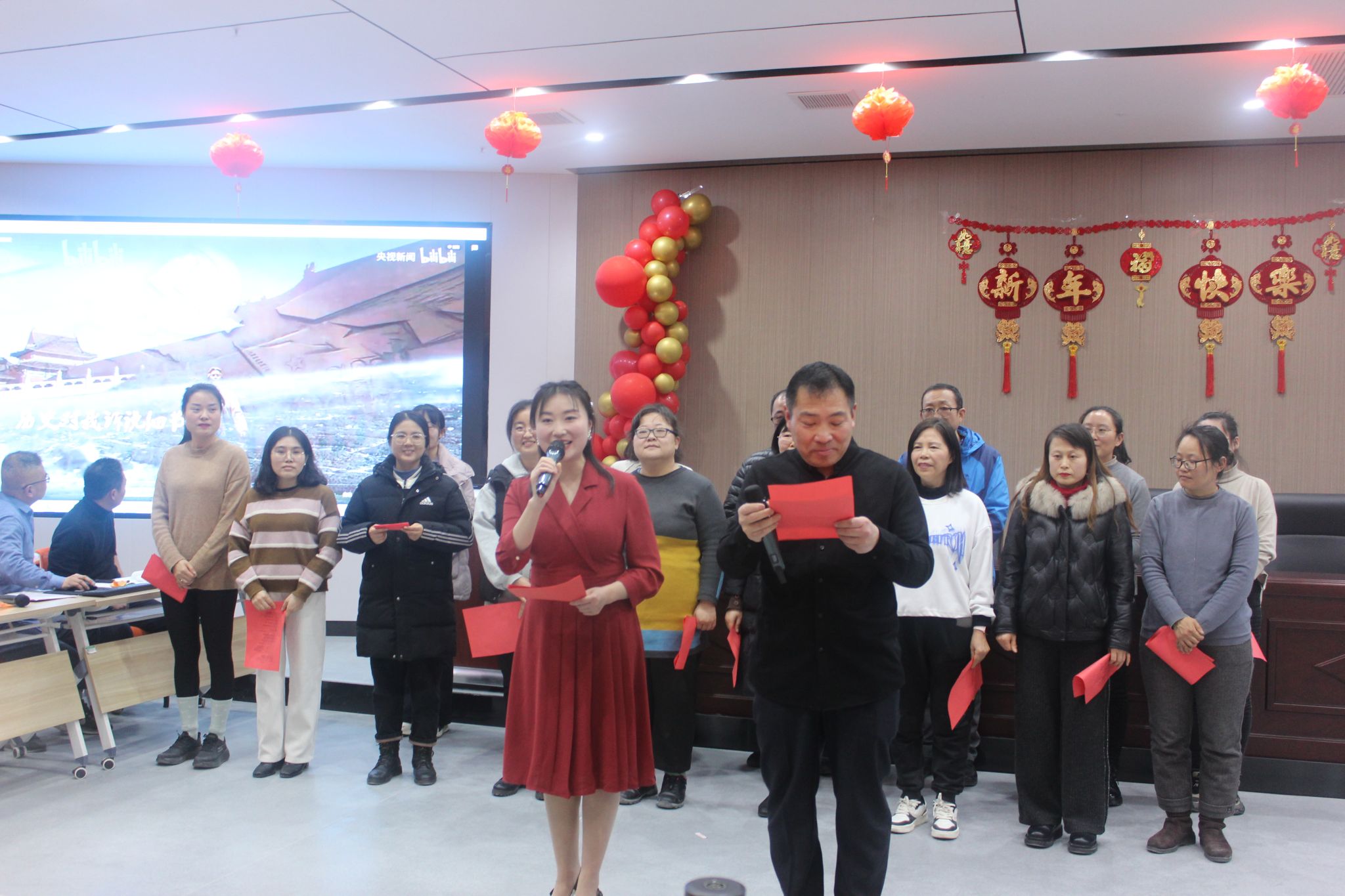 馆工会为大家准备了精彩的文艺演出,演出由刘陆军和宋璞两位馆员主持。在热烈的掌声中,采编中心的舞蹈《过年了》拉开了演出序幕,舞者身着红衣,优美起舞,传递出新年的喜悦和祝福。流通部的《三句半》表演,以幽默诙谐的方式总结了图书馆的各项日常工作,展现了图书馆人的奉献精神,引发观众阵阵掌声。期刊部陈艳艳的独唱《布谷鸟》声音清澈动人,让人感受到了春天的气息和希望。期刊部、信息部、技术部的六位老师为大家献上舞蹈《最亲的人》,舞姿优美,意态娴雅。党政办的诗朗诵《我们是离书最近的人》深情诠释了图书馆的使命与价值,表达了图书馆人对图书馆事业的热爱和坚守。馆领导班子集体登台,合唱《众人划桨开大船》,豪迈铿锵的演唱将活动推向高潮。流通部四位馆员带来活力四射的舞蹈串烧引爆全场。罗皓馆员的女儿陈乐霏小朋友表演的《年画娃娃》节目,歌声清亮,舞姿动人,靓丽可爱。期刊部、信息部联合表演的舞蹈《你的城市下雪了吗》,特藏部渠孟璟的独唱《我在春天等你》或热烈奔放,或温馨感人,赢得观众热烈的掌声。最后,信息部全体人员朗诵《盛世中国》,以激昂的语调和饱满的情感,表达了对伟大祖国的热爱和祝福,展现了图书馆人的爱国情怀和责任担当。