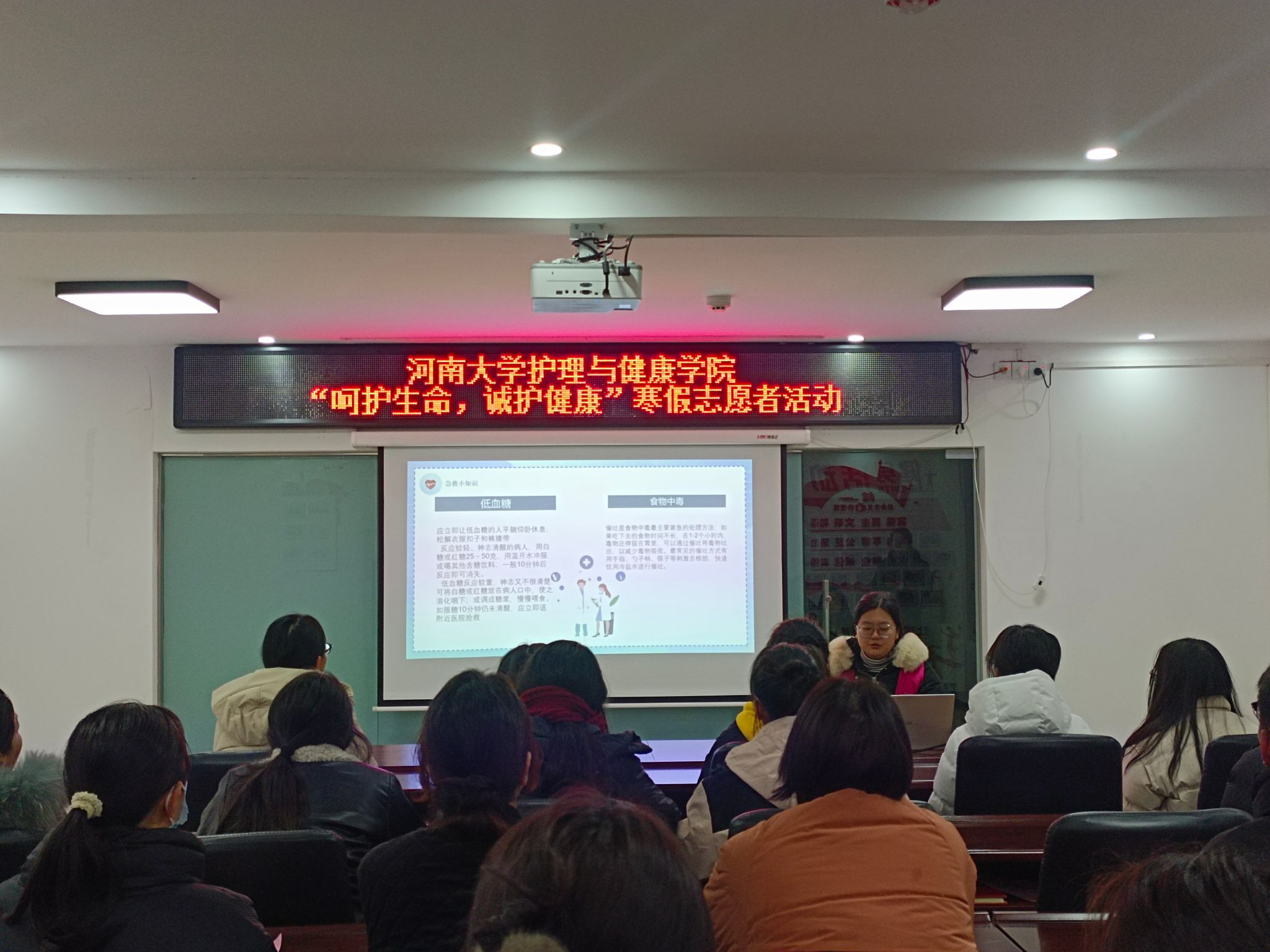随后,“春晖行动”实践团的志愿者前往明珠社区开展“呵护生命·诚护健康”主题健康宣讲活动。活动现场,志愿者发挥专业优势,利用PPT,以图文并茂的形式生动认真地为居民讲解急救小知识,如:中毒、触电等情况下如何正确实施急救。此外,志愿者们还进行卫生安全知识宣讲,介绍胃肠道疾病、流感等疾病相关知识和预防措施。现场气氛活跃,志愿者热情主动地询问居民有无相关问题,并耐心地对他们的问题逐一解答并给予专业性的建议。活动受到明珠社区居民的一致好评。此次活动进一步提高了居民预防疾病,守护健康的意识和应急救护知识。