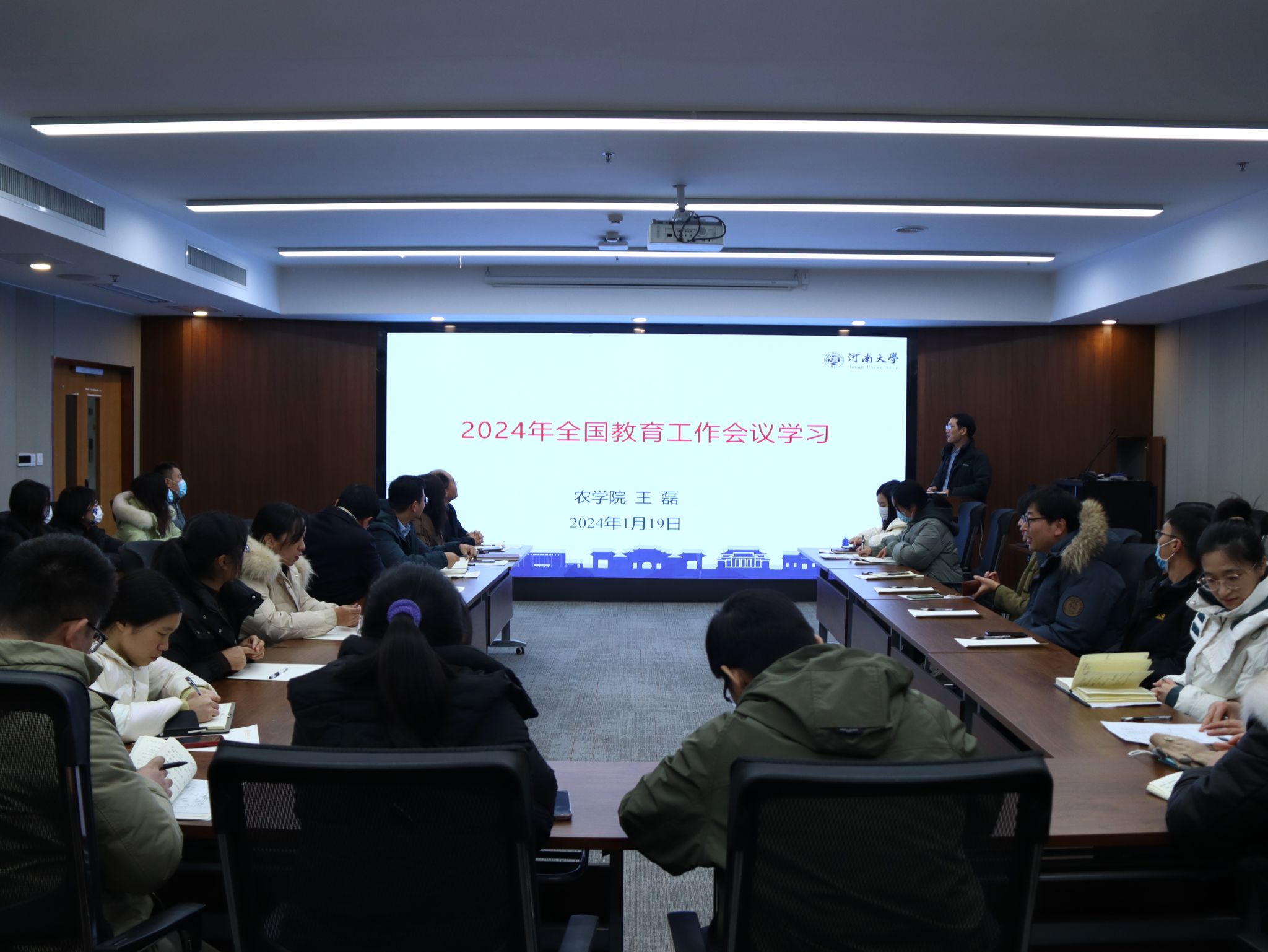 1月19日下午,农学院在作物国重101会议室召开全体教职工大会,专题学习2024年全国教育工作会议精神。会议由学院党委书记王磊领学。