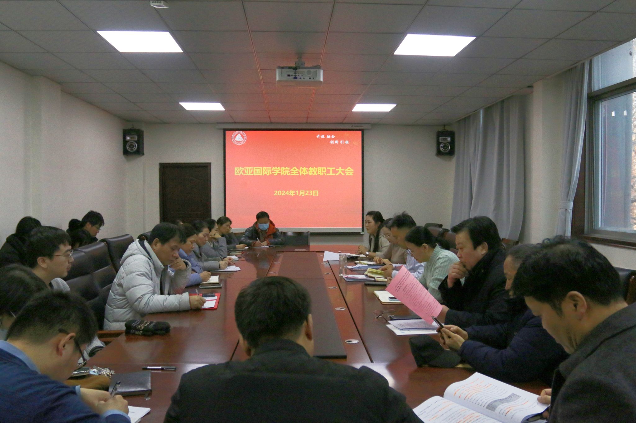1月23日下午,欧亚国际学院在学院三楼会议室召开全体教职工大会。学院全体教职工参加了会议。会议由学院党委副书记贺颖主持。