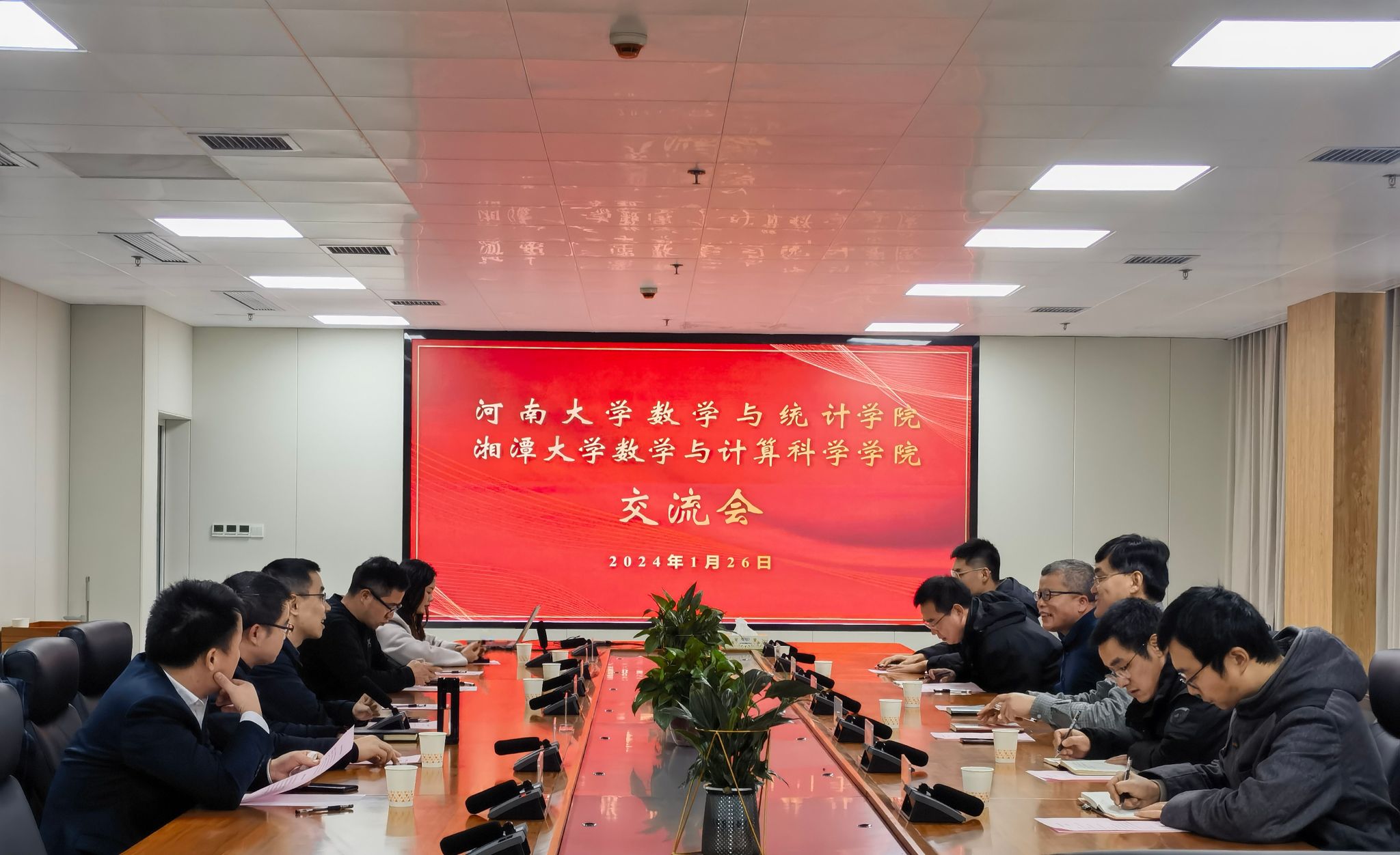 为进一步加强学科建设与发展,增进兄弟院校之间的交流互动,推动学院高质量发展,1月26日,数学与统计学院党委书记曹志伟、院长韩小森等一行六人赴湘潭大学数学与计算科学学院调研交流。湘潭大学数学与计算科学学院党委书记张普、院长杨银、湖南国家应用数学中心行政副主任黄牛武、副院长易年余、袁海专、张娟、党委副书记田坤等热情接待了调研组一行并进行了座谈交流。