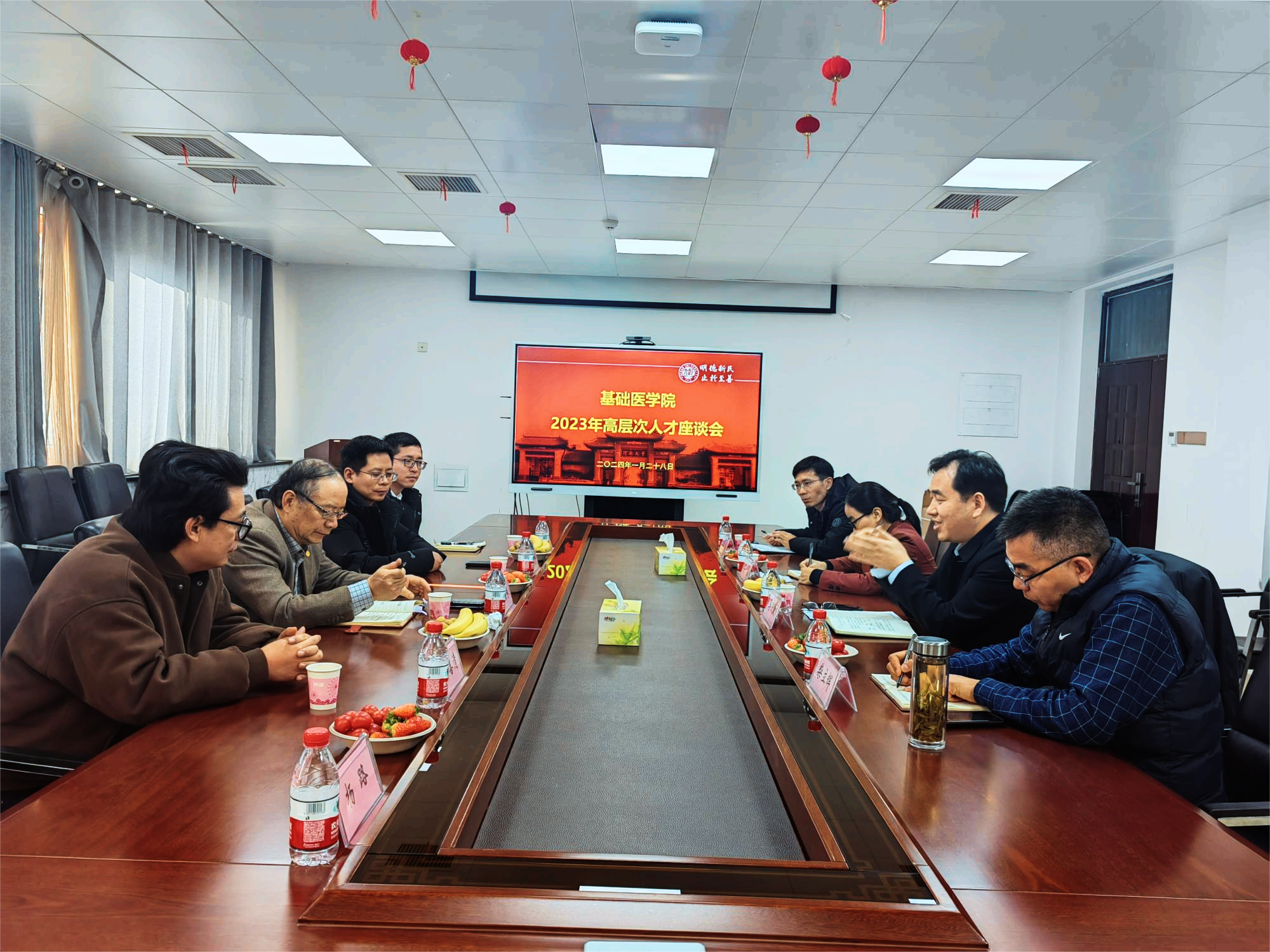 为深入贯彻落实中央人才工作会议精神,进一步做好联系服务高层次人才工作,营造尊重人才、爱才惜才的良好氛围,1月28日,基础医学院在五楼会议室召开2023年度高层次人才座谈会。学院全体领导班子成员与高层次人才、党外教师代表共迎佳节、共商发展、共话未来。会议由副院长马跃敏主持。