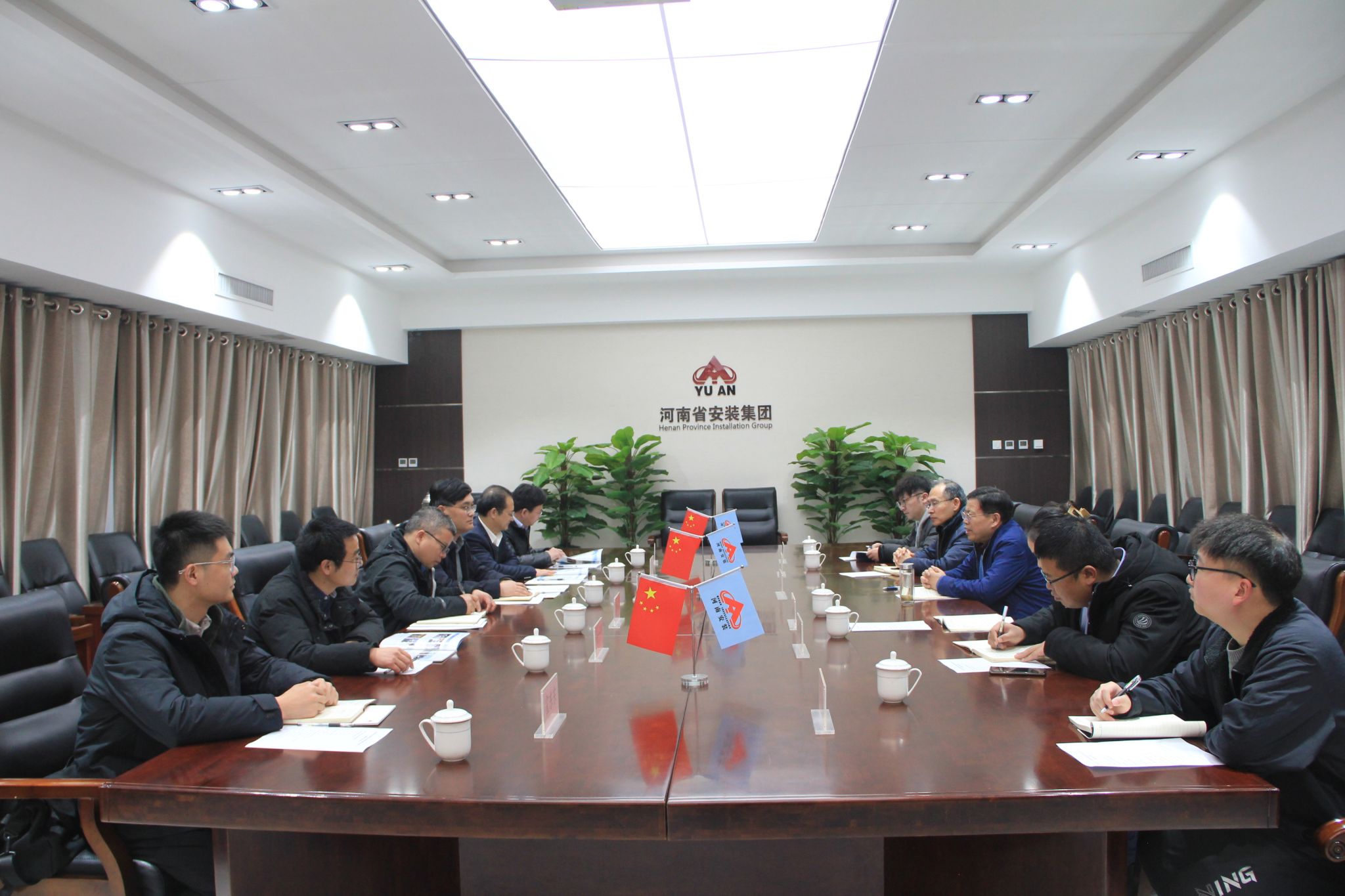 随后,曹志伟、韩小森一行来到河南省安装集团有限责任公司,受到1982级校友、河南省安装集团副总裁王致祥等公司领导的热情接待。王致祥从历史发展、经营理念、组织架构、发展战略、业务板块等方面详细介绍了安装集团的基本情况,并希望今后能够引进更多的河大优秀毕业生到公司发展。曹志伟对安装集团领导们的周到安排表达了感谢,详细介绍了学校及学院情况,并希望双方开展多层次、多元化合作,不断探索校企合作新模式,为2024届毕业生提供更多的实习和就业机会。韩小森表示,安装集团是一家集投资、设计、建设、制造、运营、维护、服务为一体的综合性、多元化、国际化、现代化企业集团,希望今后双方在学生就业、产教融合、产研融合、产学融合等方面保持密切联系,进一步开展更加深入紧密的合作。