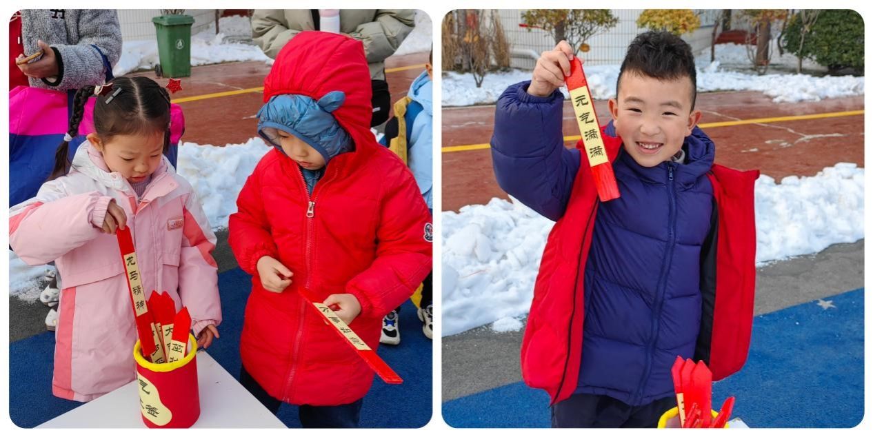 还有好玩的福气摇签活动,每一支签上都写有寓意吉祥和积极向上的词语,如“龙马精神”“平安喜乐”“大吉大利”等,代表着老师对孩子们新学期的美好祝愿。