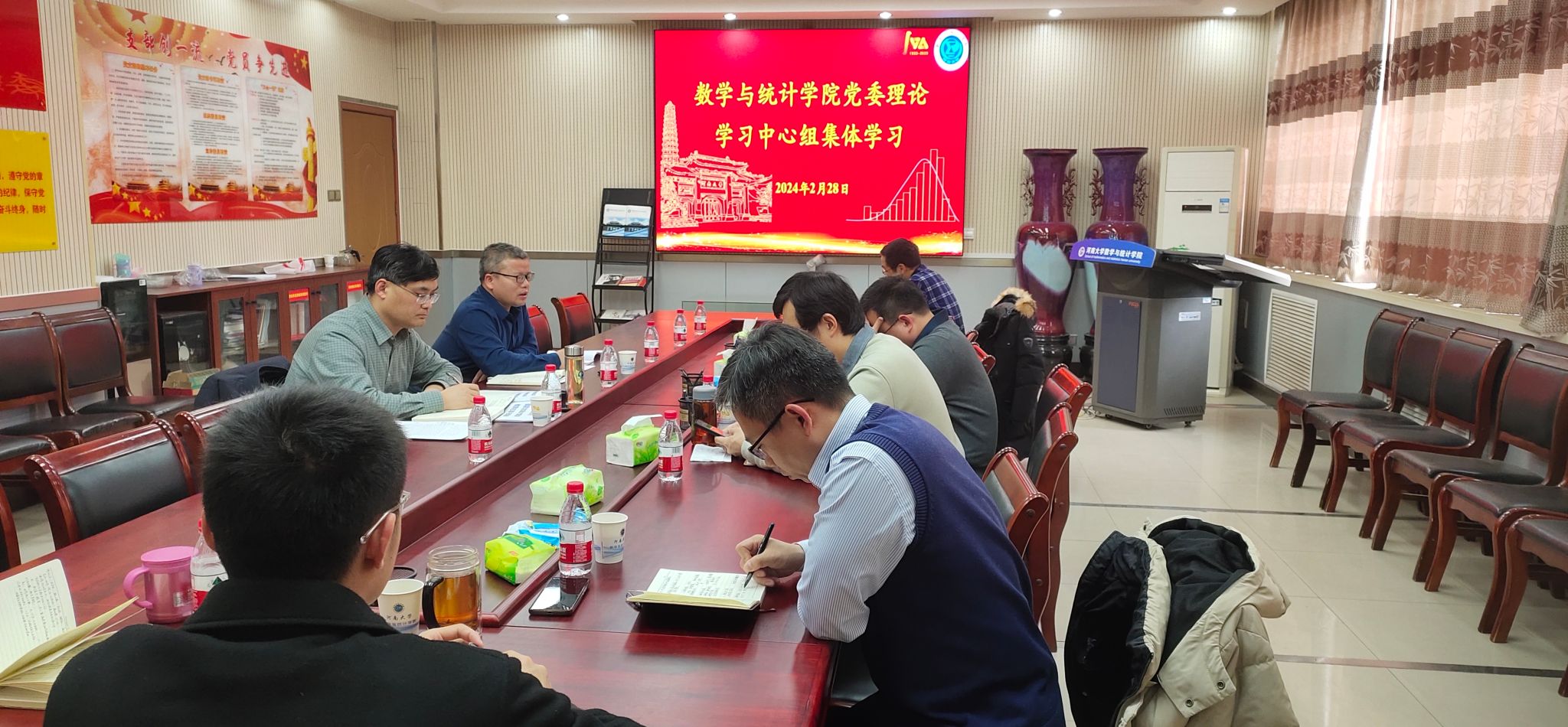 2月28日,新学期伊始,数学与统计学院党委理论学习中心组举行2024年第一次集体学习会。学院领导班子成员、党委委员、两办主任与会,深入学习习近平总书记在中共中央政治局第十一次集体学习时的重要讲话精神,谋划学院2024年重点工作。院党委书记曹志伟主持会议。
