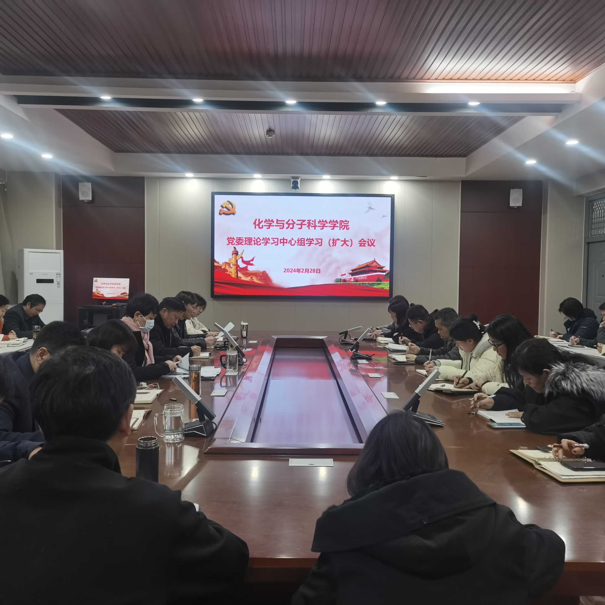 2月28日下午,化学与分子科学学院在学院220会议室召开党委理论学习中心组学习(扩大)会议,学院全体党委委员、组织员、支部书记、系室主任、高层次人才代表和学生党员干部代表等三十余人参加会议,会议由学院党委副书记马文海主持。