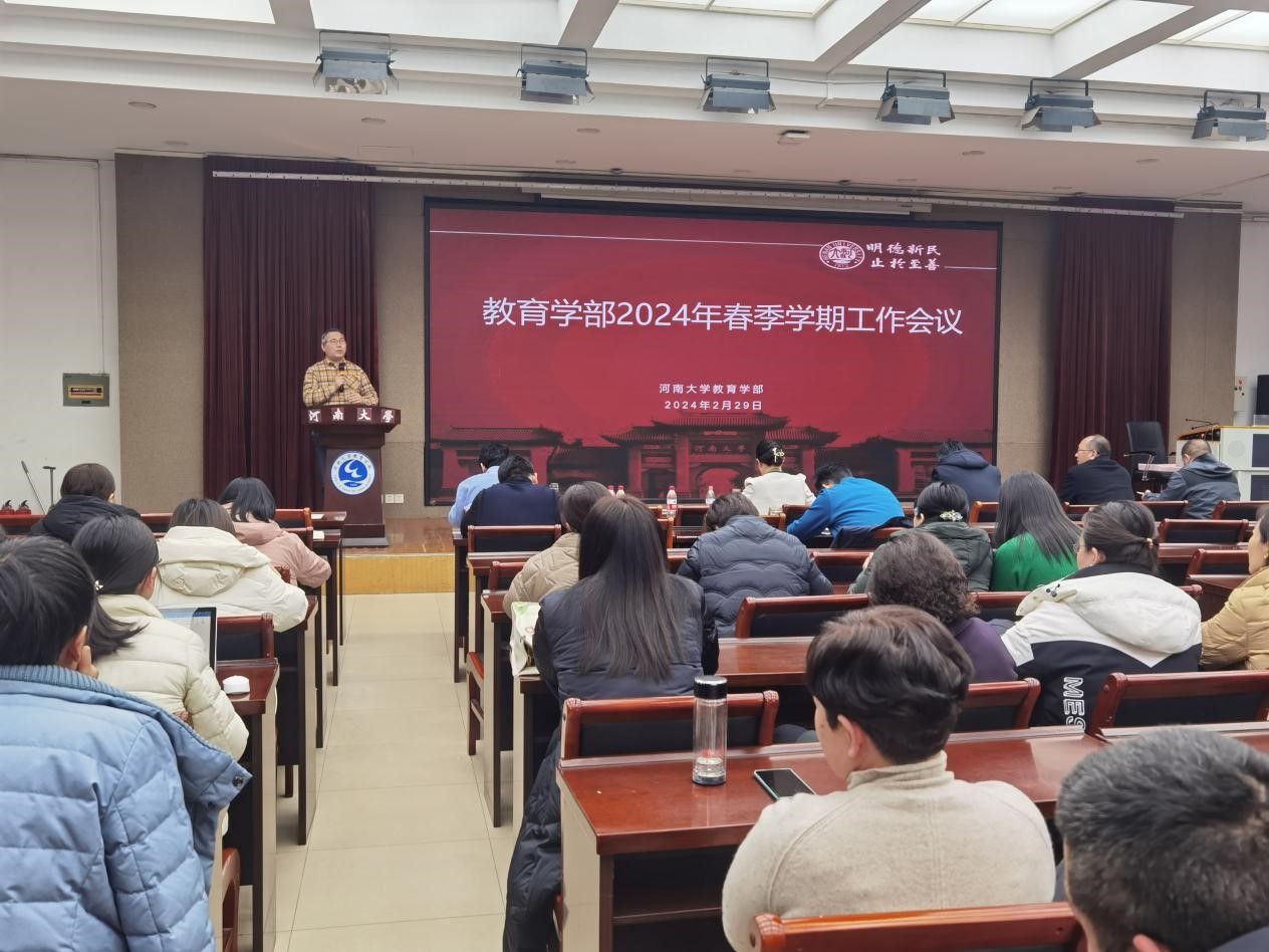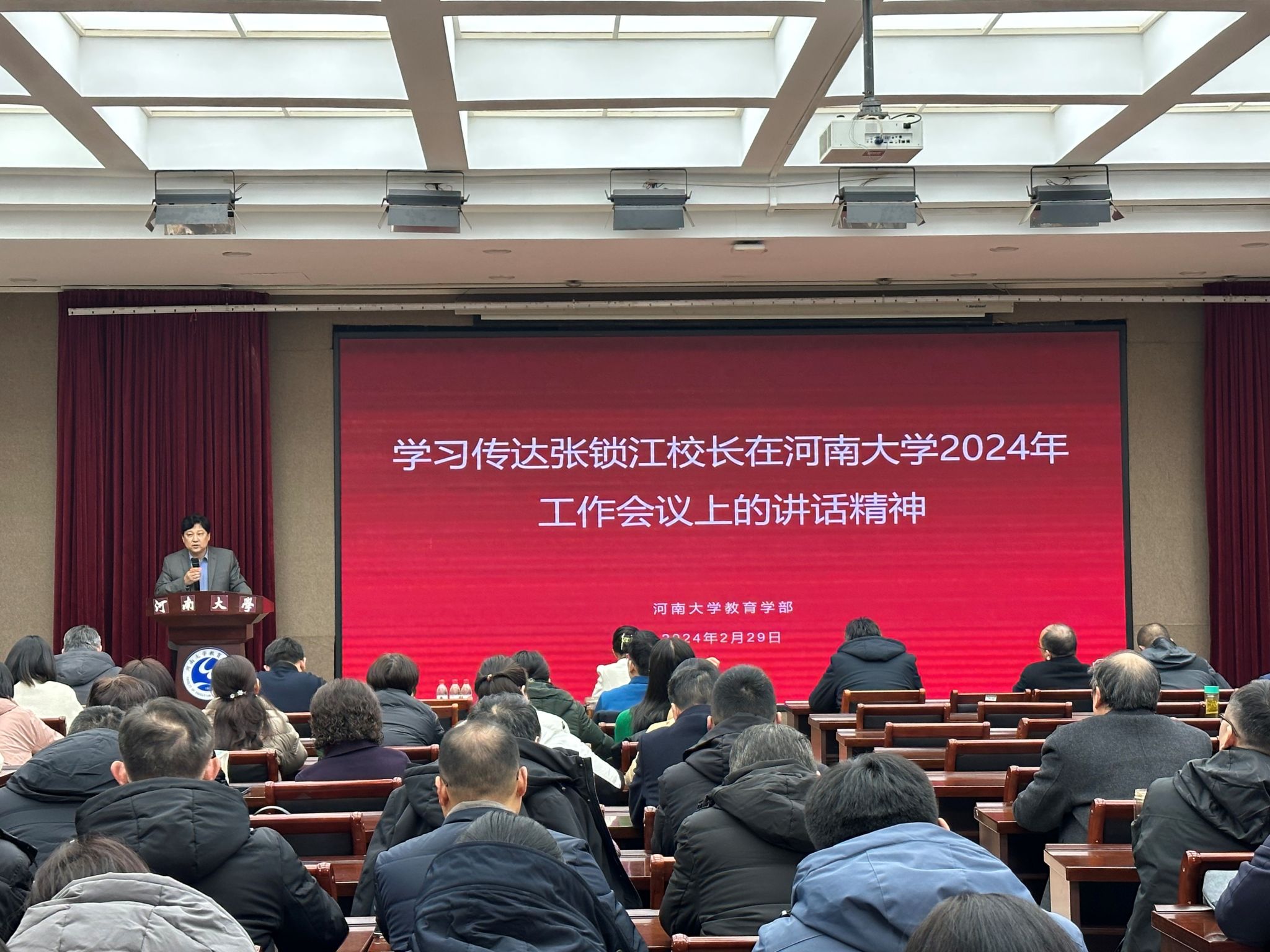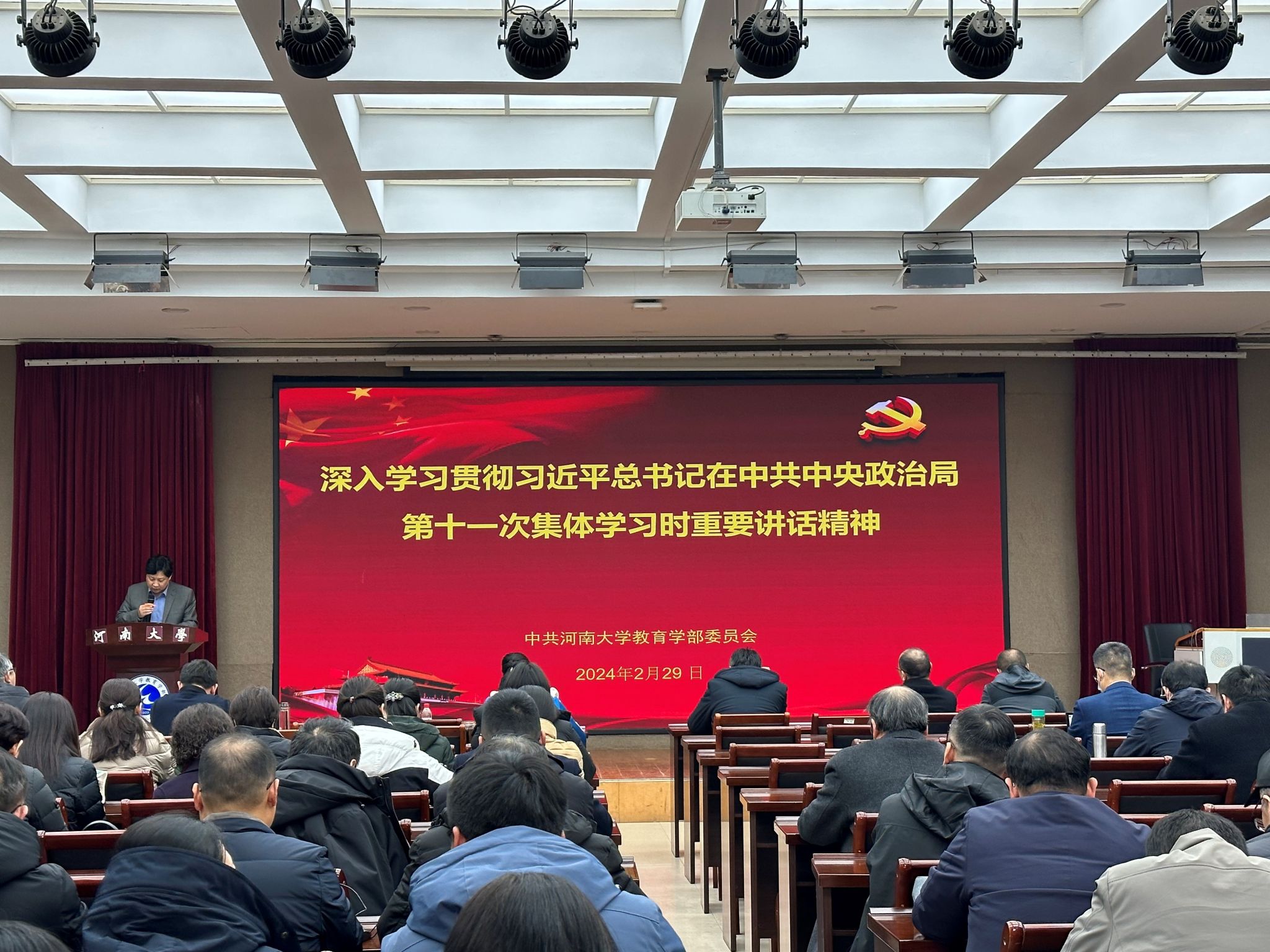 2月29日下午,在教育学部一楼报告厅举行了全体教职工理论学习暨教育学部2024年春季学期工作会议。带领全体教职工集体学习了习近平总书记在中共中央政治局第十一次集体学习时的重要讲话和张锁江校长在河南大学2024年学校工作会议上的讲话精神,由学部党委常务副书记蔡建东进行领学。