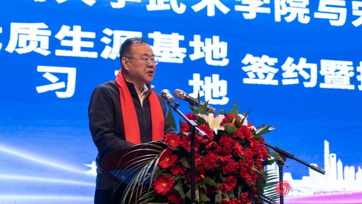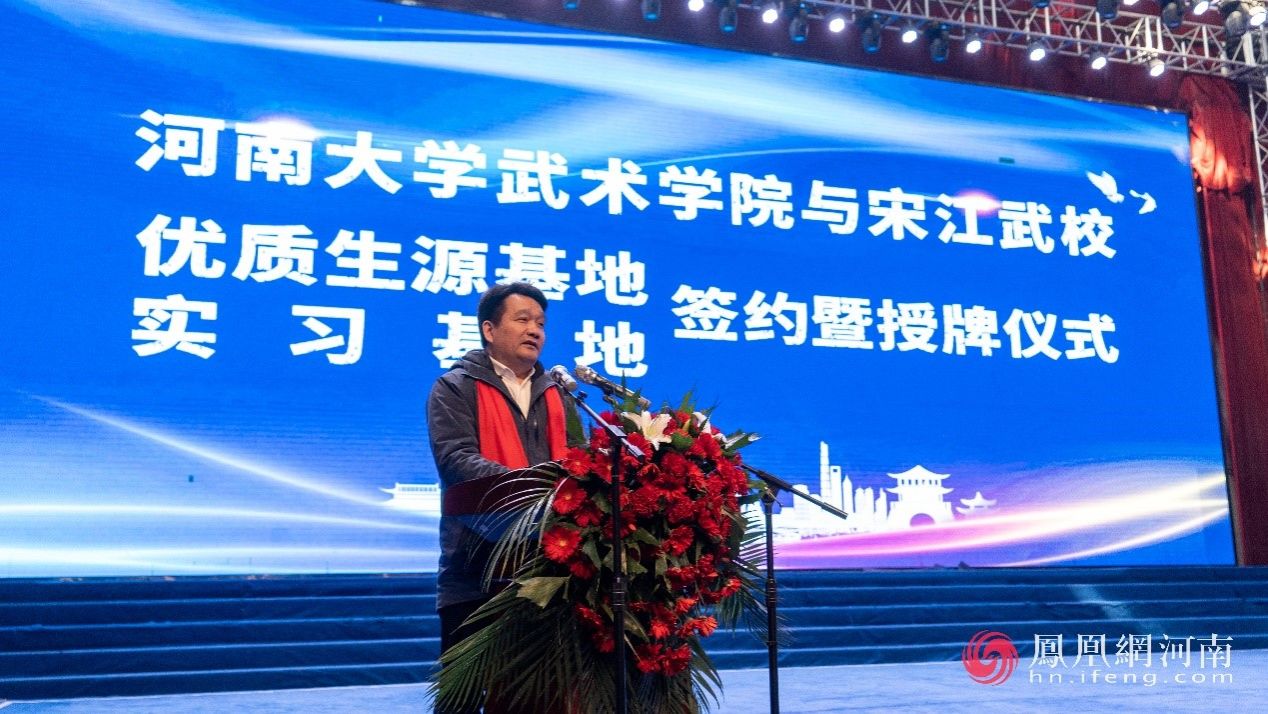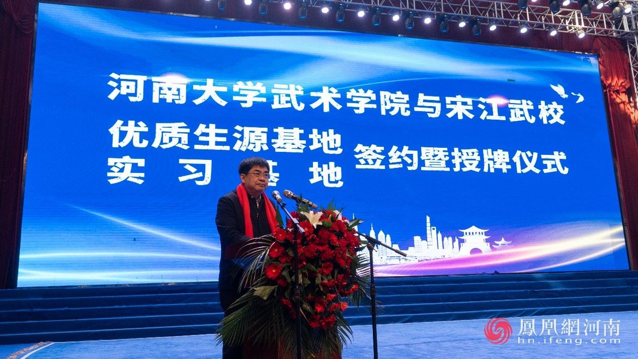 仪式伊始,与会人员共同观看了武术学院宣传片《河之武》。随即,王永和对大家的到来表示由衷的感谢和诚挚的欢迎。他表示,希望宋江武校以此为契机,突出办学特色,创新办学理念,充分发挥好“优质生源基地”和“实习基地”作用,持续为河南大学输送更多的优秀人才,着力为河南大学学生提供更加优质的实习环境。