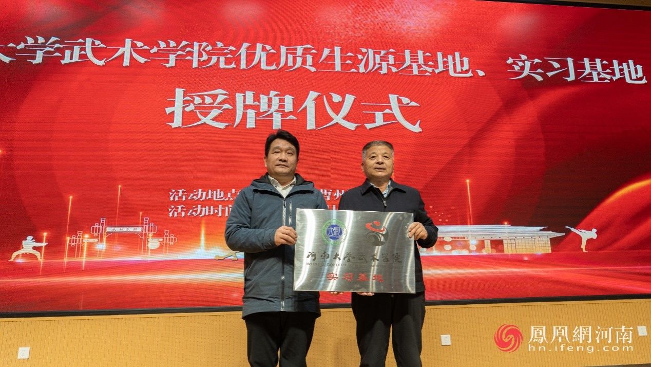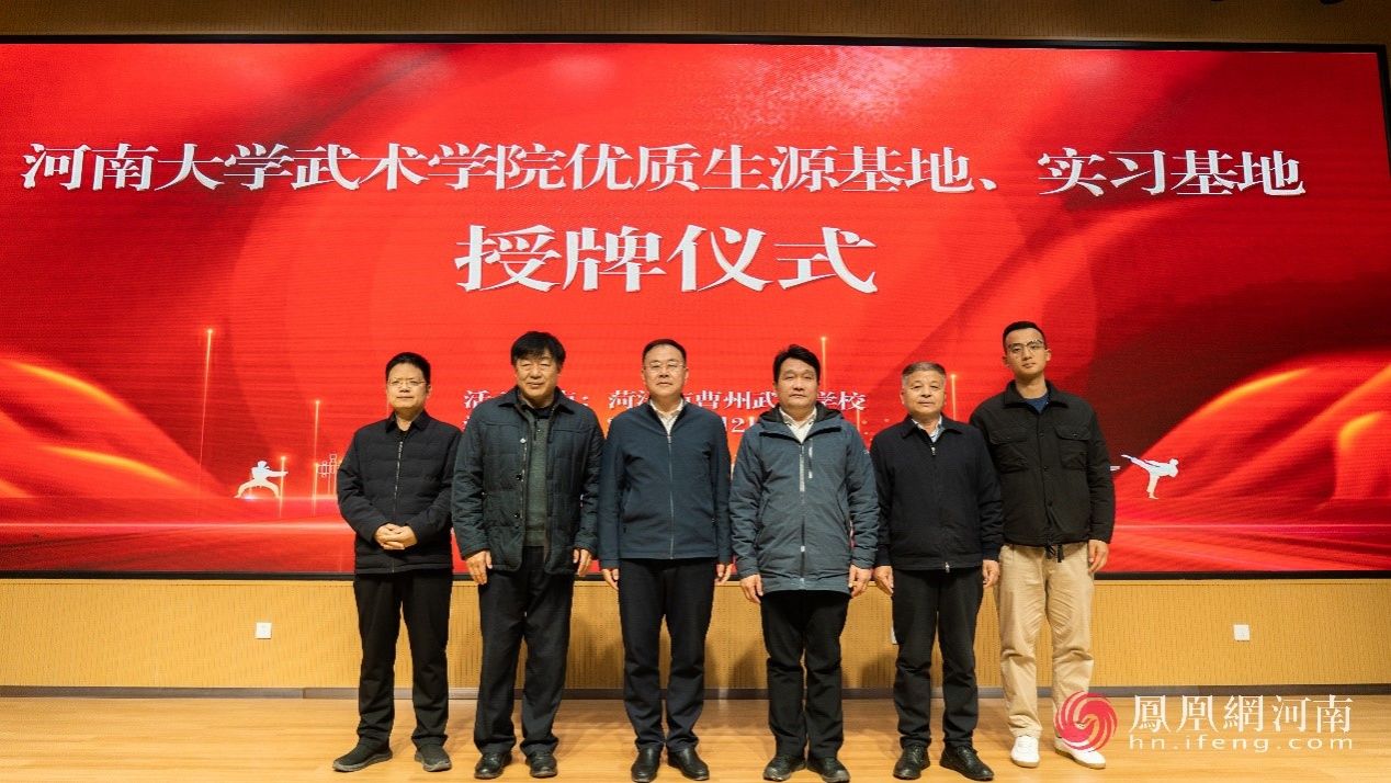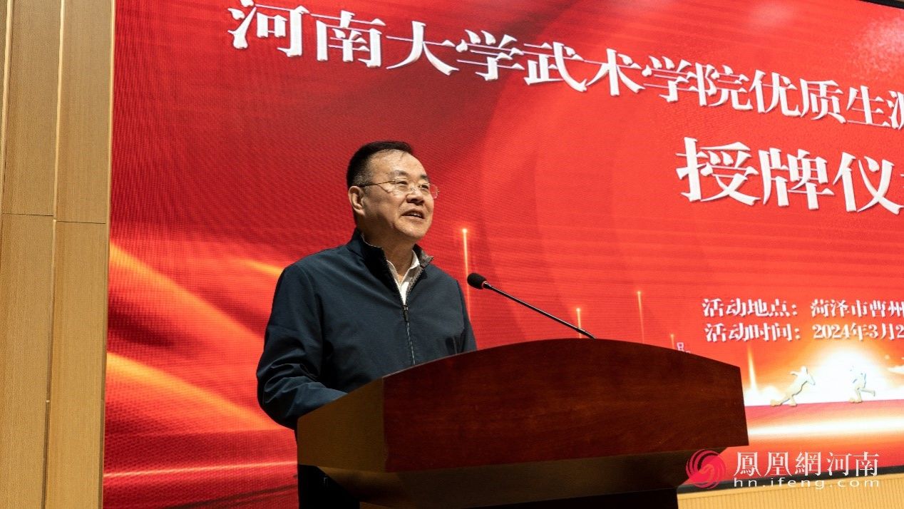 3月2日上午,“河南大学武术学院优质生源基地”和“河南大学武术学院实习基地”授牌仪式在菏泽市曹州武术学校报告厅举行。河南大学博士生导师、武术学院院长洪浩、河南大学武术学院副教授耿盛凯、菏泽市体育局党组书记、局长史长华、菏泽市曹州武术学校董事长贾其武等出席此次授牌仪式。