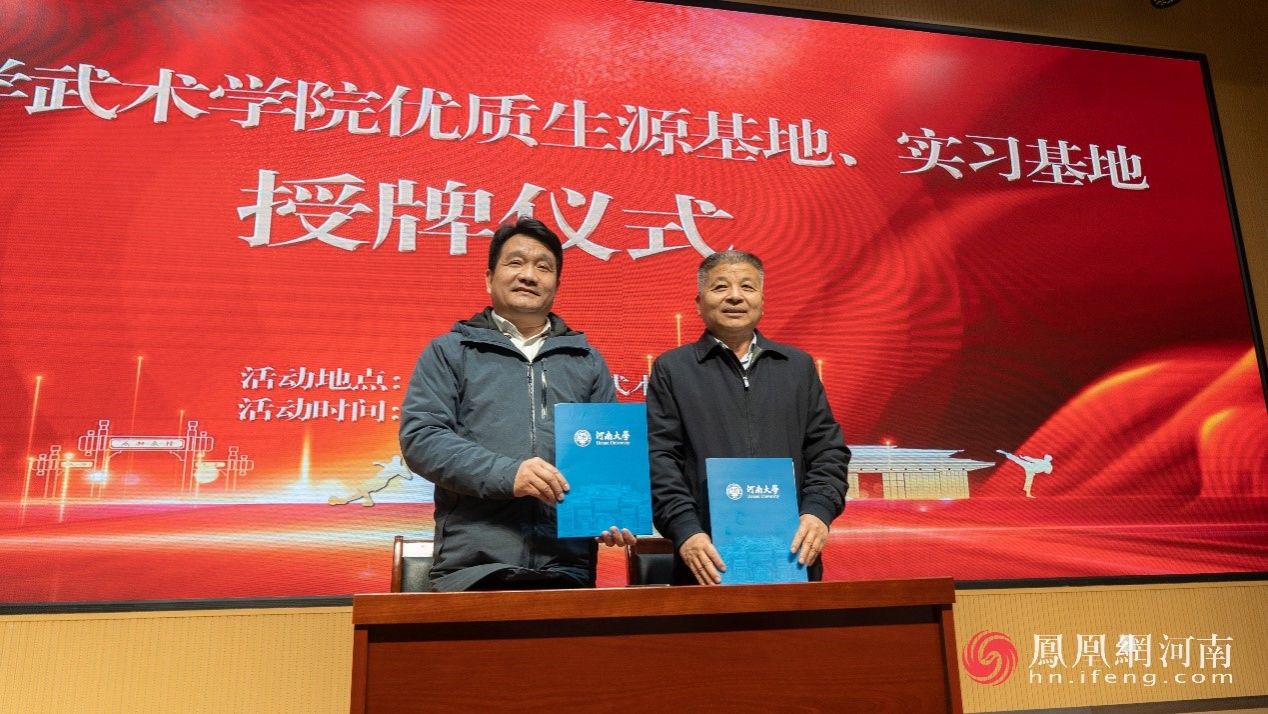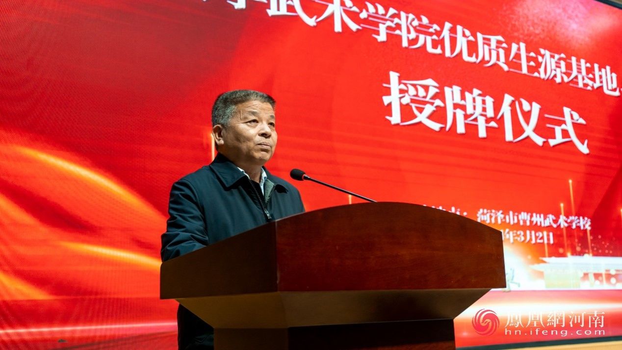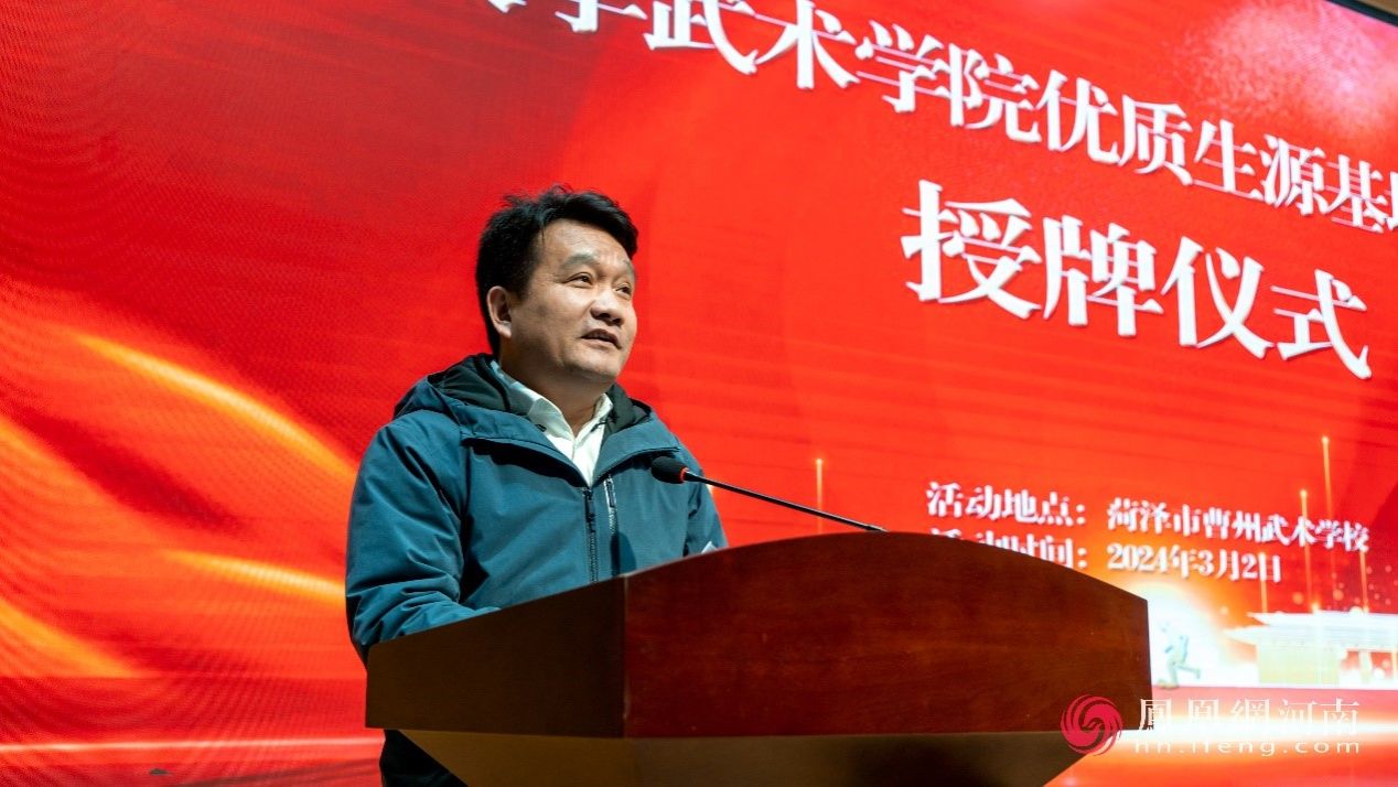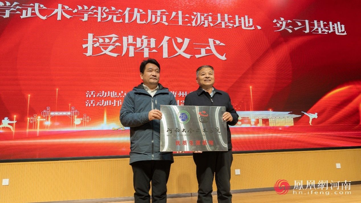 3月2日上午,“河南大学武术学院优质生源基地”和“河南大学武术学院实习基地”授牌仪式在菏泽市曹州武术学校报告厅举行。河南大学博士生导师、武术学院院长洪浩、河南大学武术学院副教授耿盛凯、菏泽市体育局党组书记、局长史长华、菏泽市曹州武术学校董事长贾其武等出席此次授牌仪式。