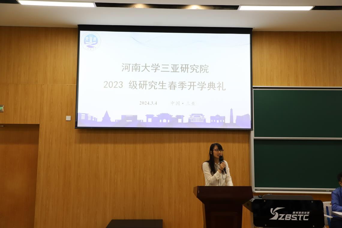 柏䶮教授对三亚研究院为河南大学研究生教育事业的艰辛付出表示感谢。她向全体师生阐释了“自信、拼搏、开放、创新”的新河大精神。她表示,河南大学的厚重历史给予广大师生挺起腰杆的自信;拼搏应当成为我们的自信之源;崖州湾科技城作为高标准打造的开放共享科创平台,广大学子有幸开放获取优质资源;2024年作为河南大学的创新年,三亚研究院的学子们应当以实际行动积极落实学校创新发展要求,敢于追求,无悔青春,谱写青春靓丽篇章,把优秀成果谱写在祖国的天涯海角!