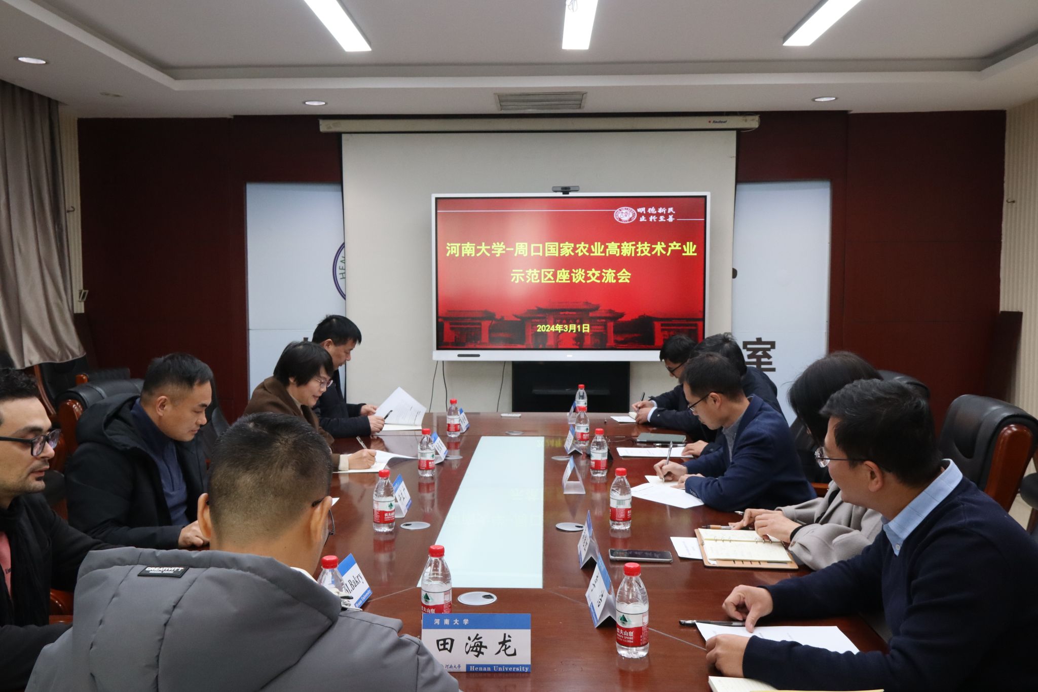 3月1日下午,河南大学与周口国家农业高新技术产业示范区座谈交流会在棉花生物育种与综合利用全国重点实验室202会议室举行。郸城县人民政府副县长、现代农业产业研究院院长张福丽,周口国家农业高新技术产业示范区副主任韩金银,河南现代农业高科技投资有限公司经理仵立广一行到校交流。河南大学科学技术研究院副院长邓浩,中原学者、河南大学特聘教授黄继红,农学院执行院长王道杰,省部共建作物逆境适应与改良国家重点实验室/河南大学棉花生物育种与综合利用全国重点实验室副主任彭李超,农学院副院长李浩以及农学院教师代表参加座谈会。会议由李浩主持。