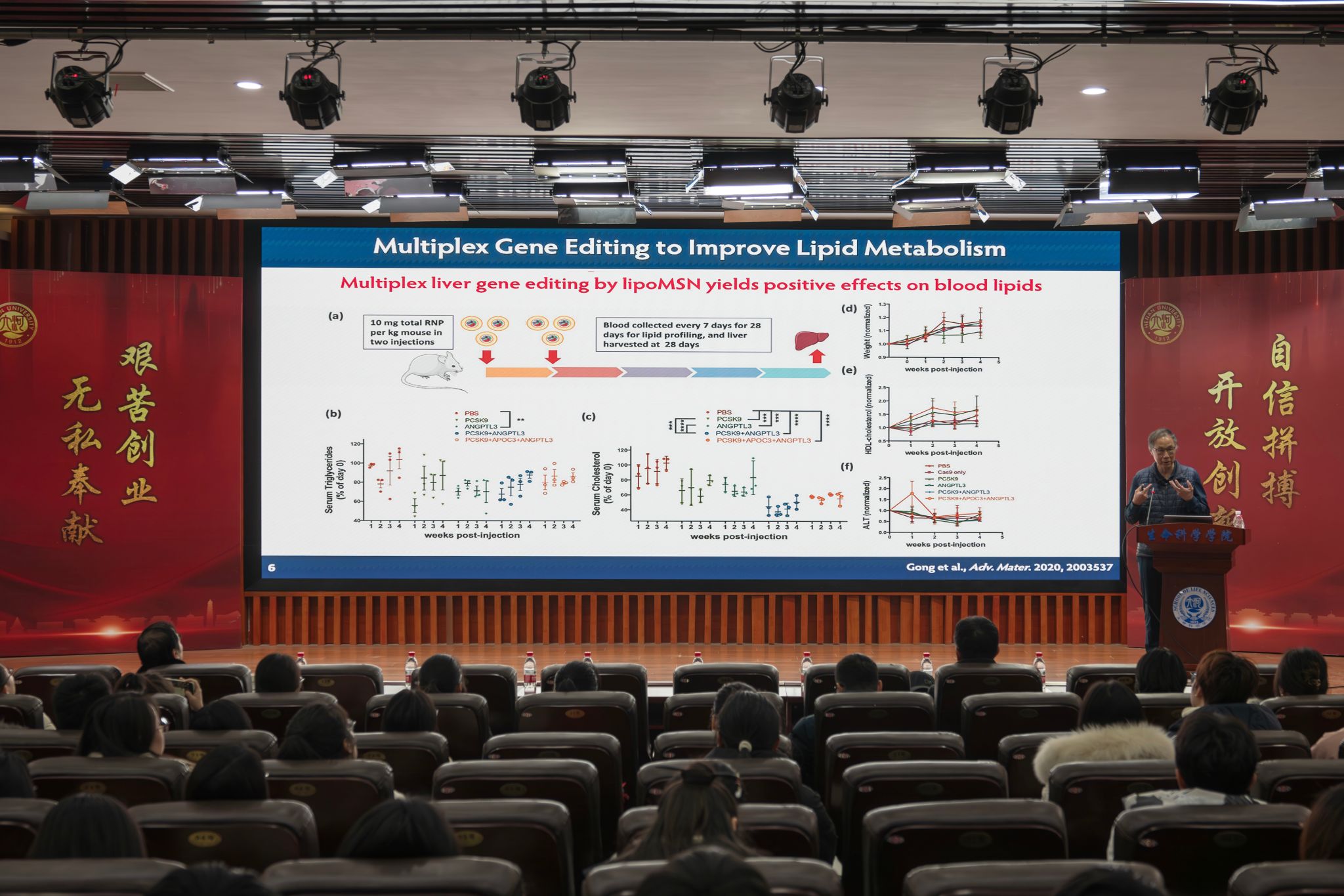 梁院士针对基因编辑元件的有效体内递送这一关键科学问题展开报告,详细介绍了其团队在体内基因编辑非病毒载体的开发方面所做的努力。重点介绍了团队开发的三代高分子递送载体口服递送基因编辑药物的脉络及生物医学应用,并且通过大规模筛选开发了高效脑部递送的脂质体制剂,并利用聚焦超声(FUS)的方式实现静脉给药基因药物有效穿越血脑屏障(BBB),从而达到脑部疾病基因编辑的目的。内容从点到线到面,给大家带来了一场非常精彩且全面的学术报告。提问环节,参会的老师、学生就报告内容以及自己在科研中遇到的困惑提出了问题,梁院士认真倾听并详细做解。