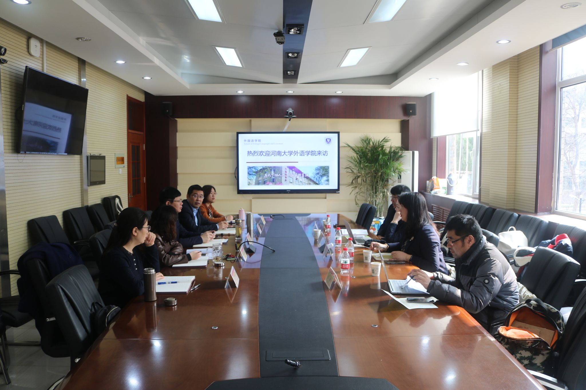 3月6日,外语学院党委书记肖艳、院长张璟慧带队一行四人前往山东大学外国语学院调研交流。山东大学外国语学院党委书记刘华、院长马文会见并召开调研座谈会。参加座谈会的有山东大学外国语学院副院长刘洪东、副院长董记华、翻译系主任赵爱萍,以及河南大学外语学院副院长付江涛、翻译系主任侯健。座谈会由马文主持。