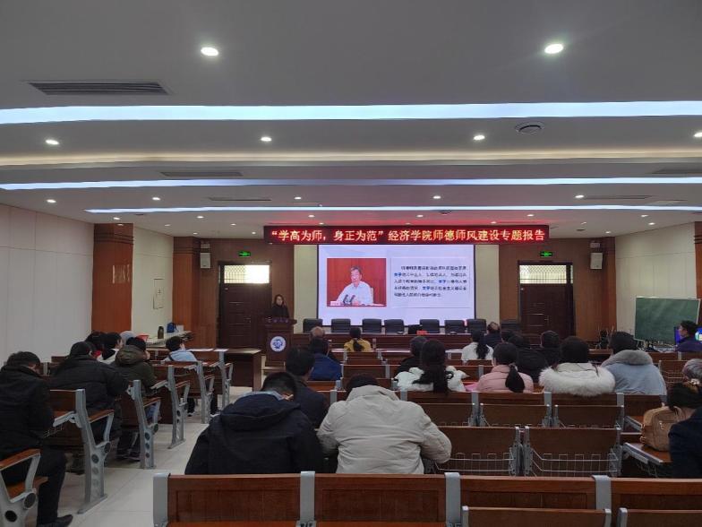 3月7日下午,经济学院在学院二楼报告厅举行了师德师风建设专题报告会,学院邀请校党委教师工作部副部长赵炎作题为“树良好师德师风 做河南大学好老师”的专题报告,全院教职工参加了会议。会议由学院党委副书记翟志远主持。