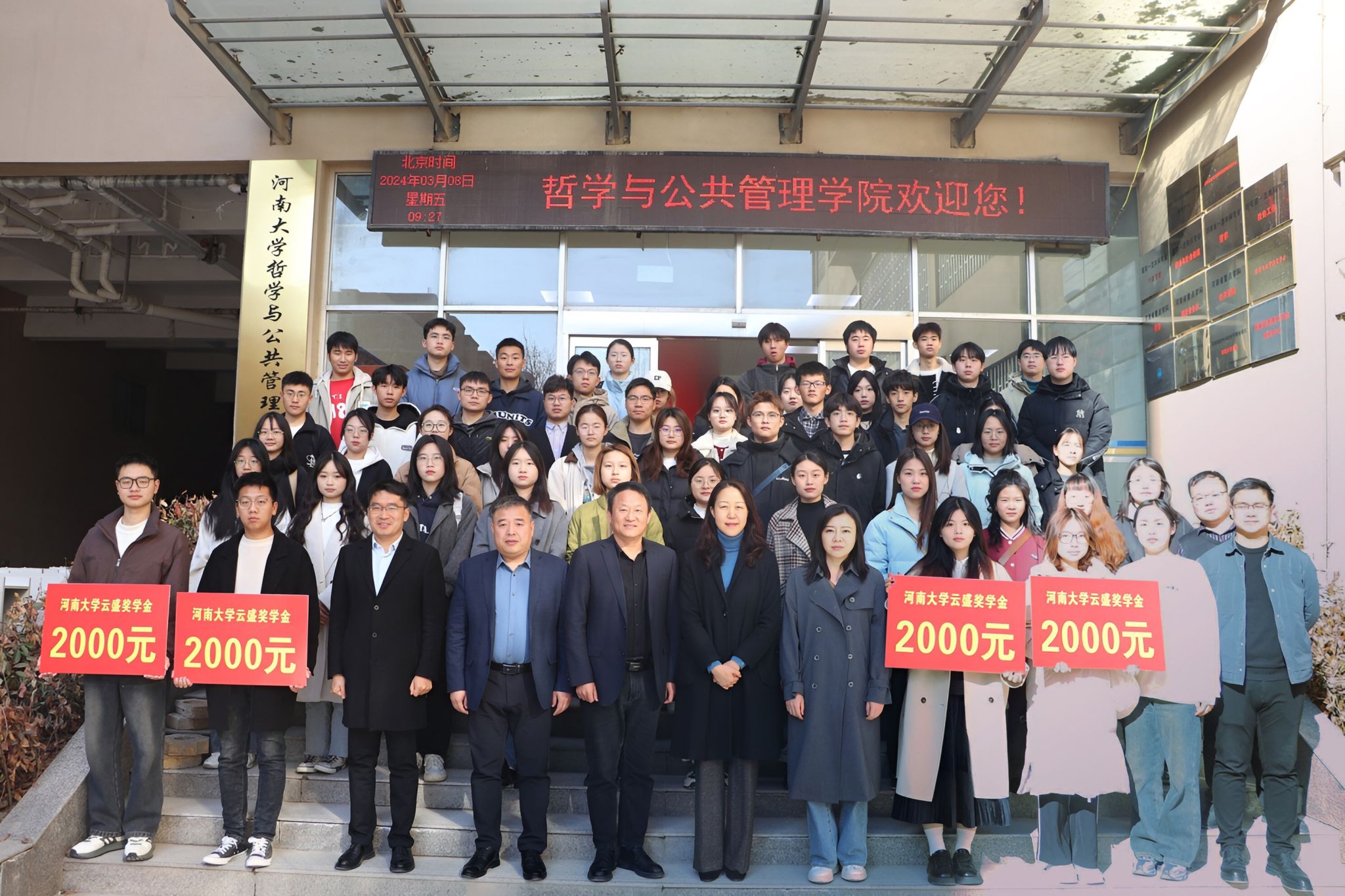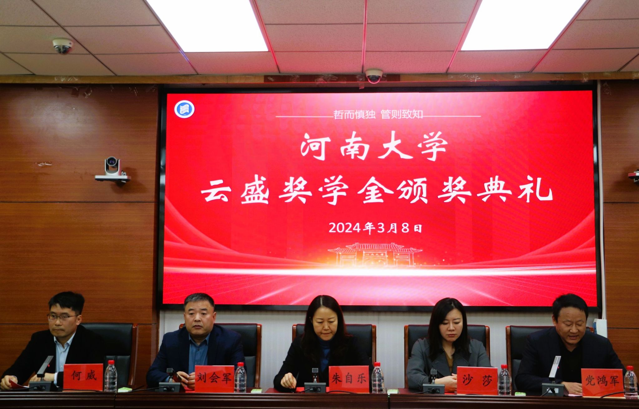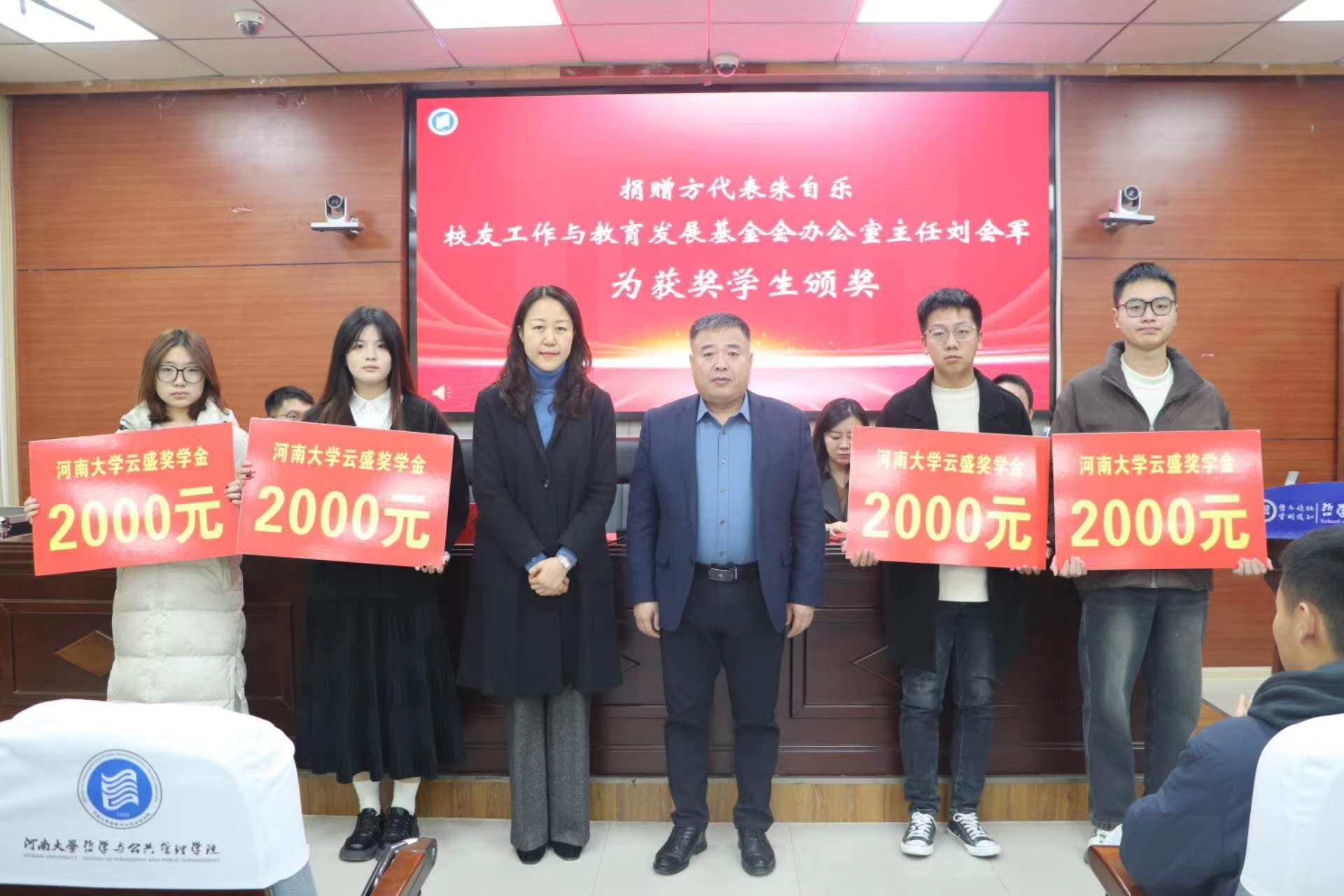 3月8日上午,河南大学“云盛奖学金”颁奖典礼在哲学与公共管理学院第一会议室举行。云盛基金捐赠方代表朱自乐女士,校党委学生工作部部长、学生处处长沙莎,校友工作与教育发展基金会办公室主任刘会军,哲学与公共管理学院党委书记党鸿军参加颁奖典礼。颁奖典礼由哲学与公共管理学院党委副书记何威主持。