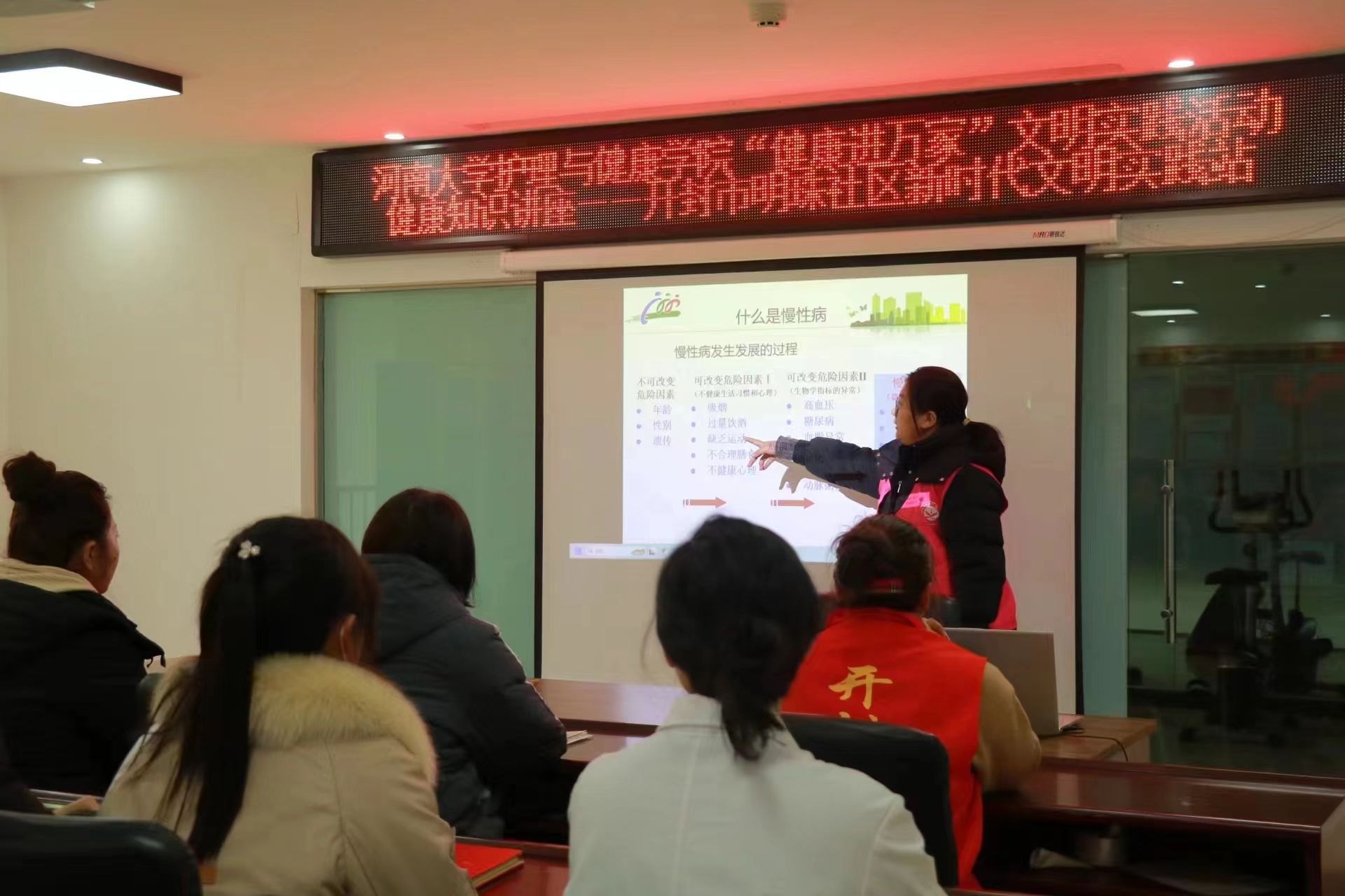 为普及健康知识,增强社区居民的健康意识,提升健康素养和主动健康能力,3月6日上午,护理与健康学院南丁格尔志愿服务队的志愿者,在开封市城乡一体化示范区金耀街道办事处明珠社区开展了“健康进万家”文明实践主题活动。