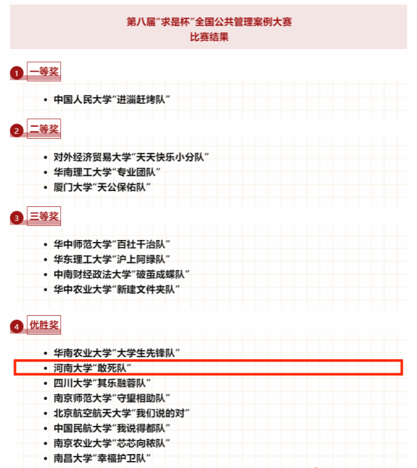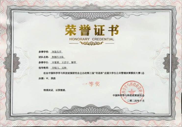 在第三届“寻是杯”全国大学生公共管理决策模拟大赛总决赛中,由学院李晓玉、元帅老师指导,2022级本科生李董祺、王浩宇、解菲三位同学组成的河南大学智圆行方队,在同全国7个赛区决赛晋级的北京大学、中国人民大学等90所高校代表队的激烈角逐中脱颖而出,荣获全国总决赛一等奖。