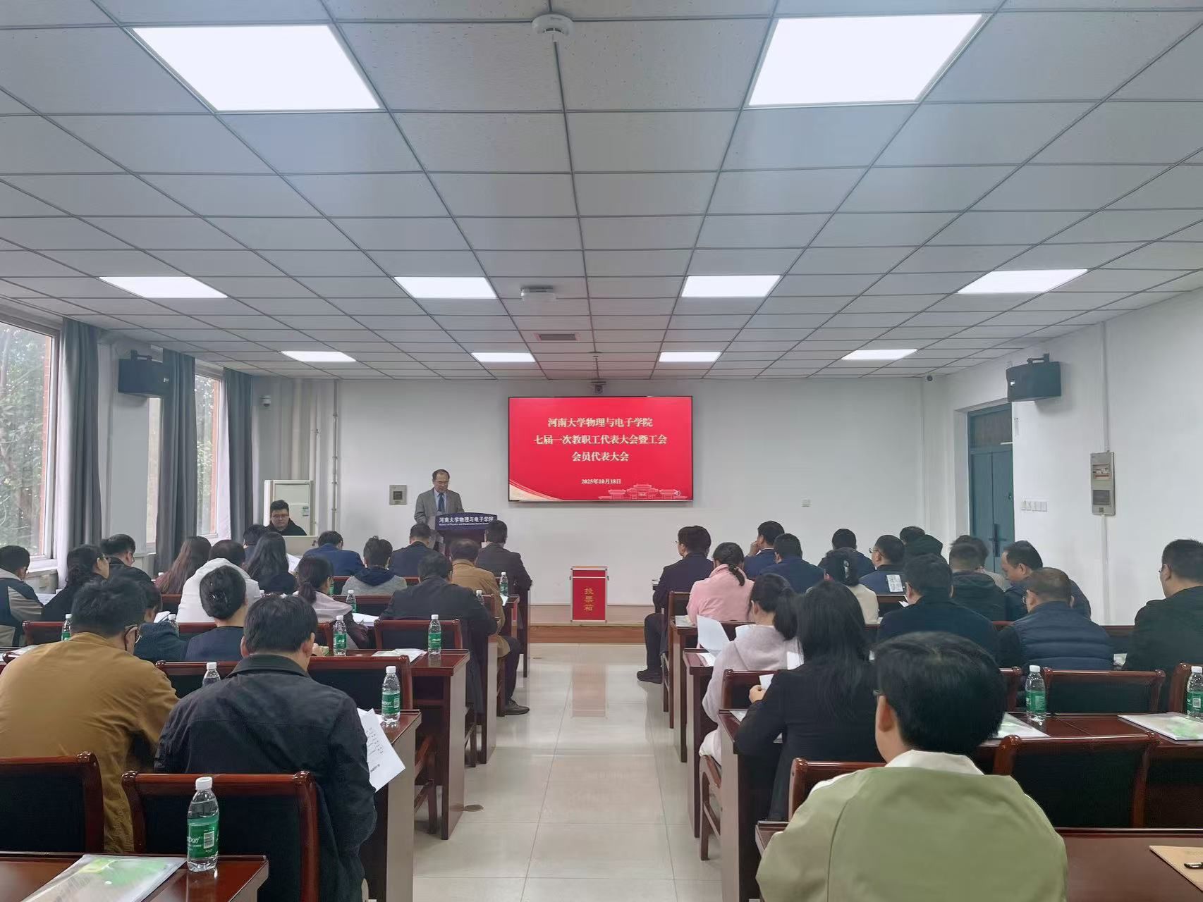 大会选举产生了七届“双代会”委员会委员,表决通过了三个专门工作组名单、《学院工会报告》《工会工作报告》《物理与电子学院职称评审推荐实施细则》。