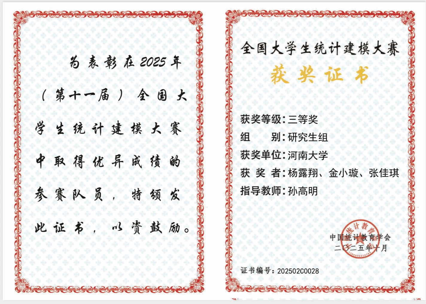 10月26日,第十一届全国大学生统计建模大赛国赛答辩赛在东北财经大学落幕,我校数学与统计学院两支研究生团队凭借扎实的学术功底与创新应用能力,双双获奖。《助力“健康中国2030”战略——面向脑部疾病诊断的多模态脑影像智能融合研究》表现突出,在全国总决赛中荣获河南省唯一的国家二等奖;《红斑鳞状皮肤病智能辅助诊断——基于多模态数据与MedViT方法》荣获国家三等奖。