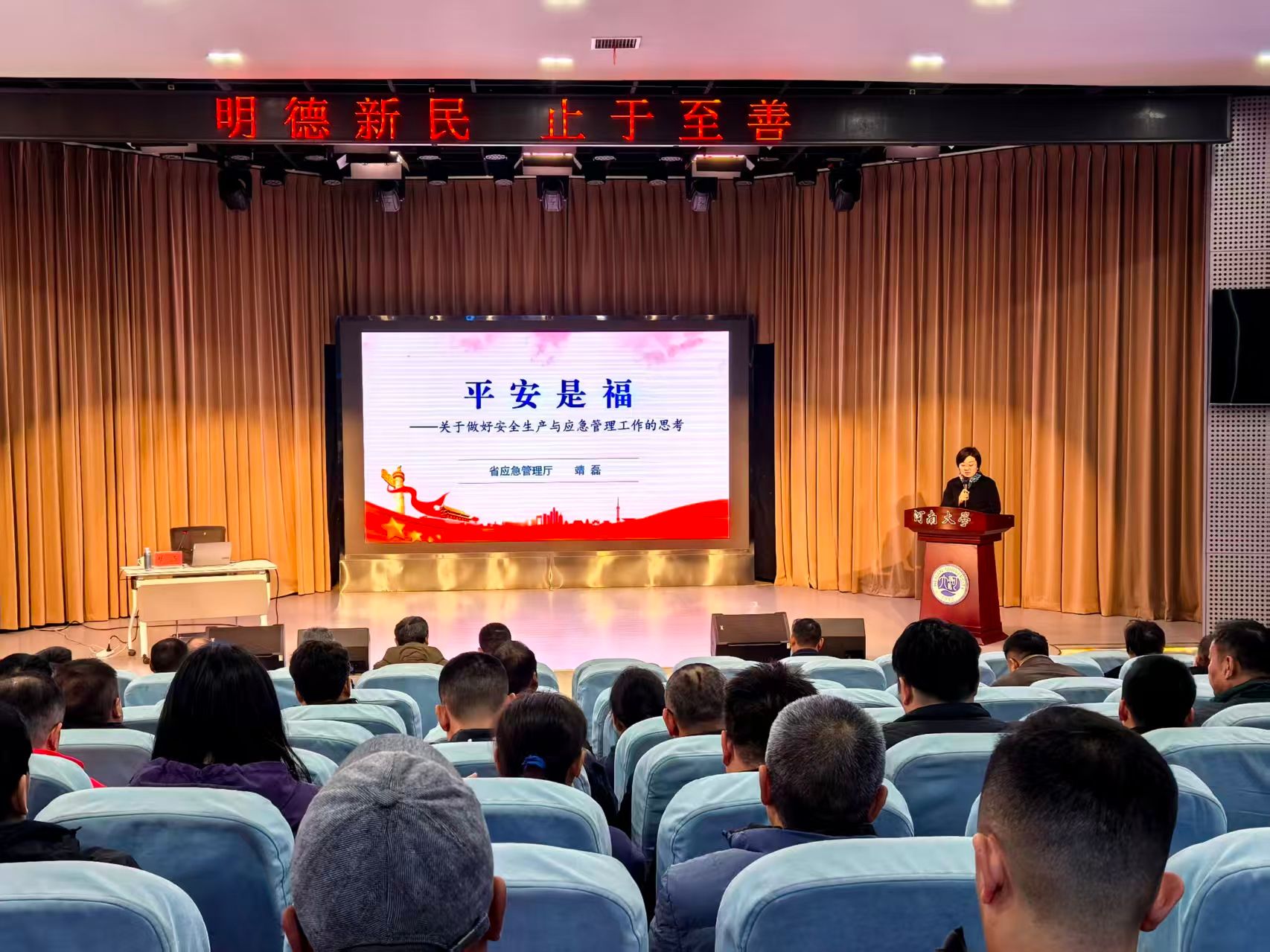 为深入贯彻落实习近平总书记关于安全生产的重要论述,进一步提升职工安全生产意识与应急管理能力,夯实校园安全发展基础,11月5日上午,后勤保障部党委在明伦校区逸夫科技馆学术报告厅举办安全生产与应急管理专题培训。河南省应急管理厅人事处处长靖磊应邀作专题报告。后勤保障部党委、总务处(后勤集团总公司)、保卫处、基建处全体领导班子成员及全体人员参加培训。讲座由党委常务副书记张亚歌主持。