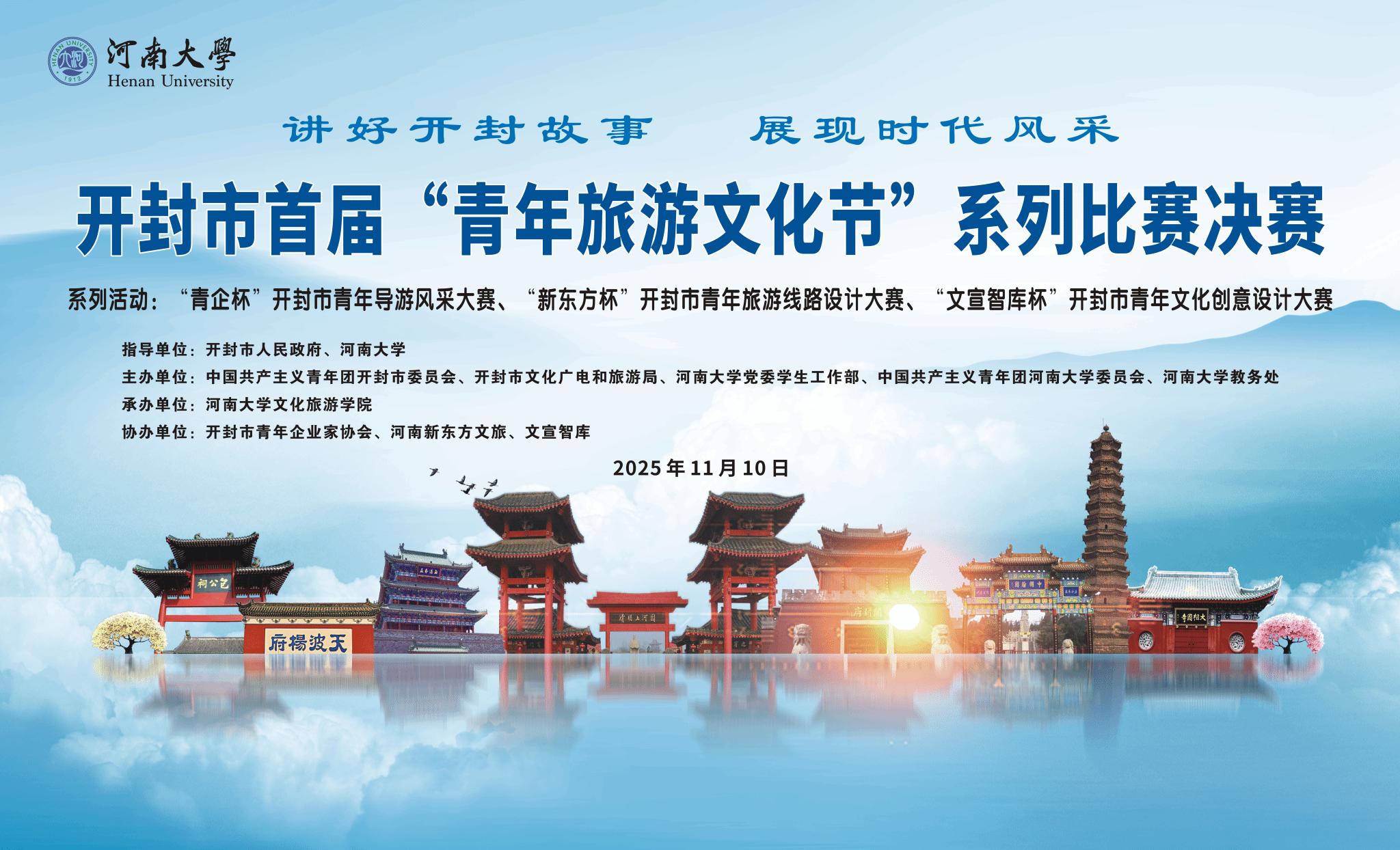 开封市首届“青年旅游文化节”系列比赛,由共青团开封委员会、开封市文化广电和旅游局,河南大学团委、学生处、教务处主办,河南大学文化旅游学院承办,河南新东方文旅、文宣智库、开封市青年企业家协会倾力支持。比赛聚焦青年群体,构建“文化+旅游+赛事”三位一体模式,通过多元化赛事激发其创新活力,搭建青年人才与城市发展双向赋能的桥梁,活动充分发挥文化旅游学院的学科优势,整合中国旅游研究院文化旅游研究基地等科研平台资源,推动赛事专业化与成果转化,形成学界与业界的协同创新格局。