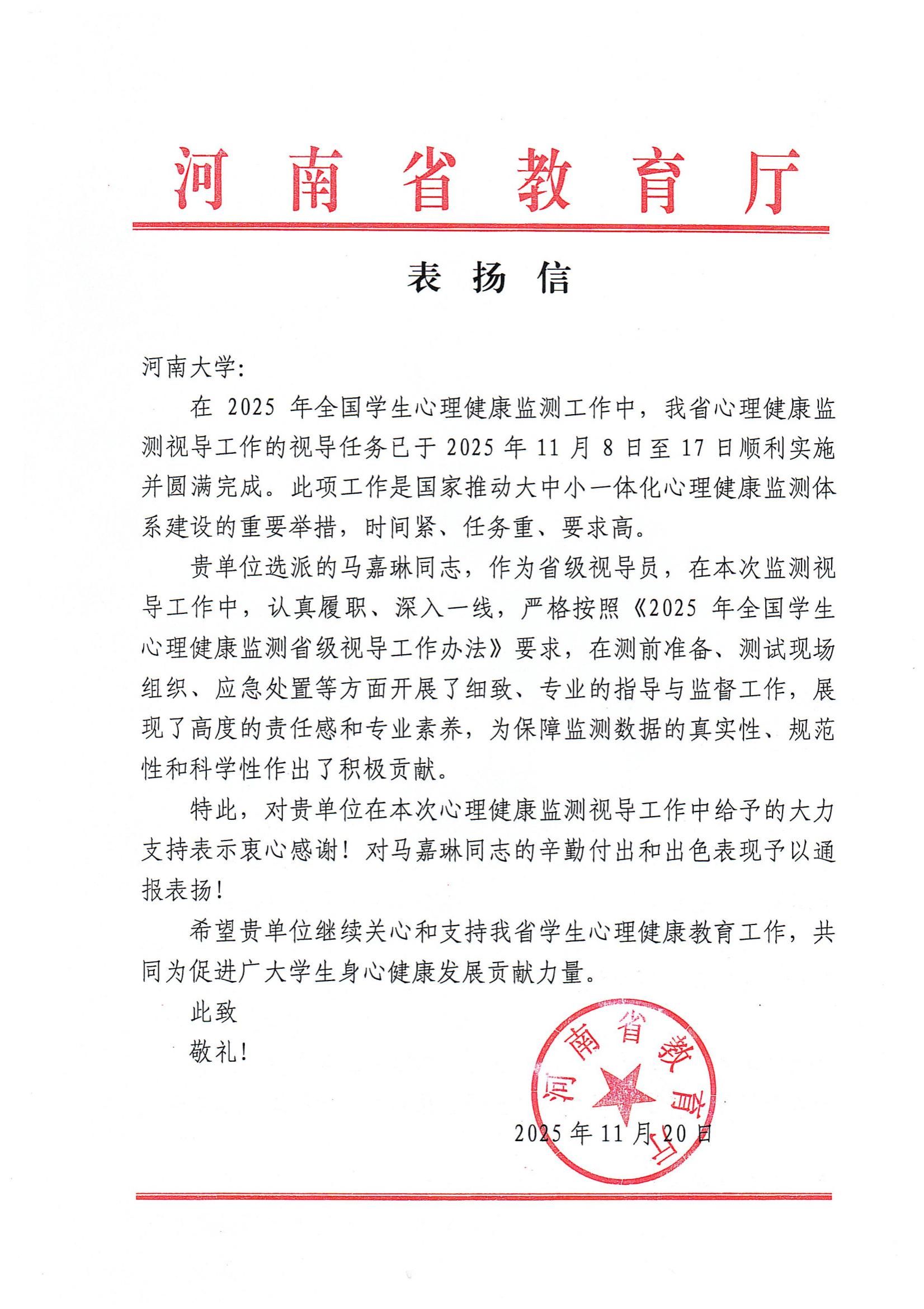 近日,河南省教育厅向我校发来表扬信,对教育学部心理学院青年教师马嘉琳在2025年全国学生心理健康监测省级视导工作中的出色表现予以通报表扬。